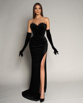 V Neck Feather-Accented Evening Dress with Mermaid Side Split and Open BackWe could custom made 70+ colors & all sizes, if you do not find the color name listed, pls leave a message with special instructions to note the exact color you need.Also custom size is available, if you need your dress customized, pls leave...