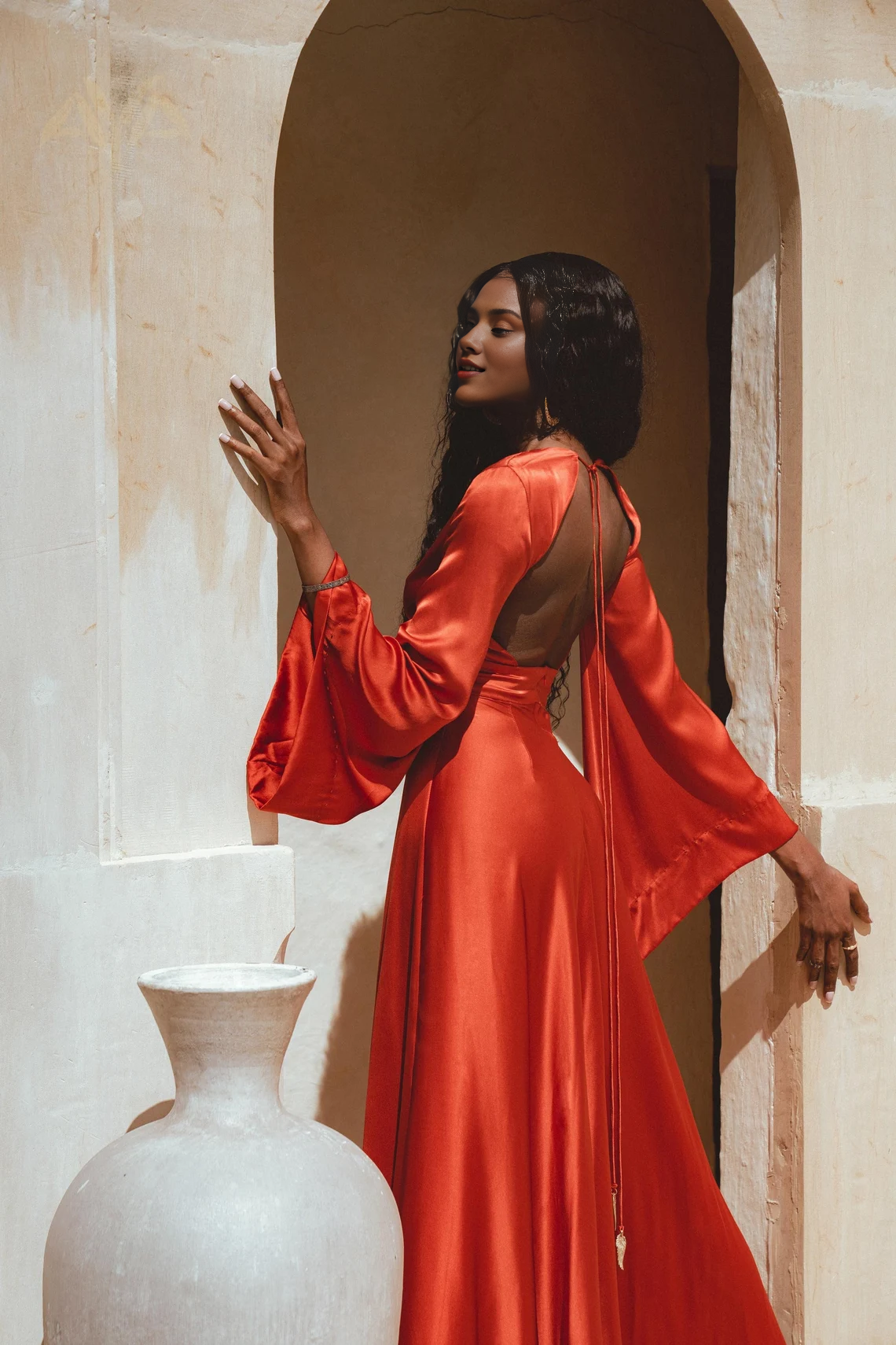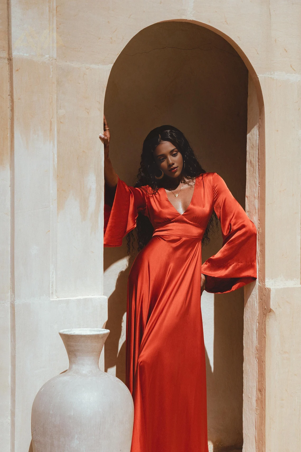 A-line Deep V Neck Long Sleeves Backless Floor Length Bridesmaid Prom Party Dress