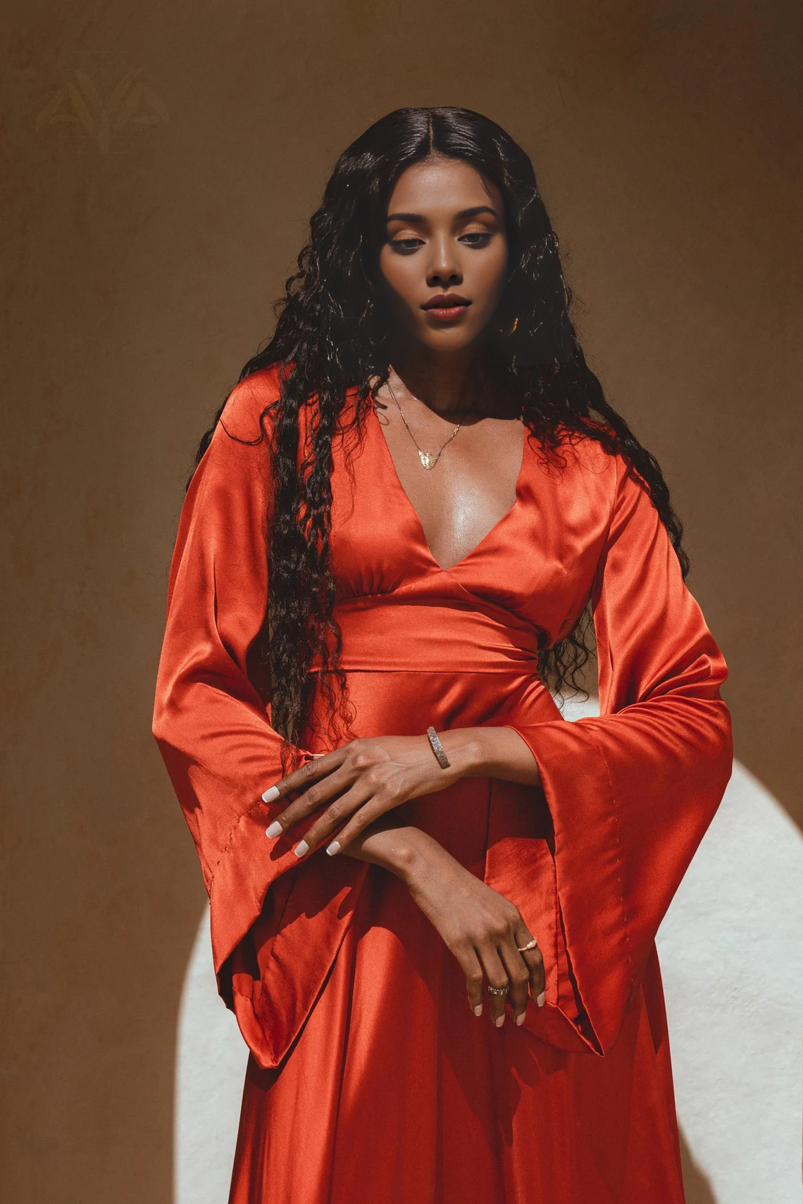 Style: ElegantSilhouette: Mermaid / TrumpetHemline / Train: Sweep / Brush TrainNeckline: Plunging NeckFabric: SatinClosure: Zipper UPSleeve Length: 3/4 Length SleeveEmbellishment: RuchingWrap: No