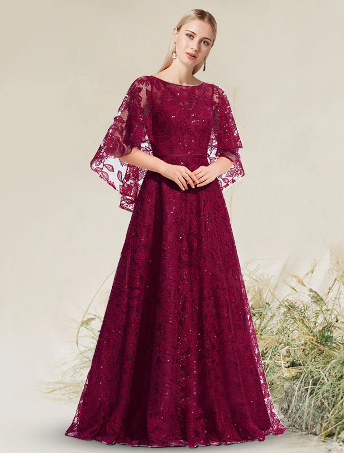 A-Line Elegant Floral Wedding Guest Formal Evening Birthday Dress Jewel Neck Short Sleeve Floor Length Lace with Appliques