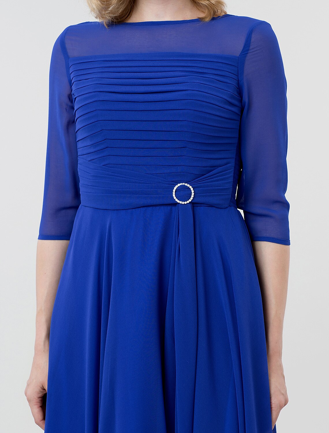 A-Line Elegant Formal Evening Wedding Party Dress Boat Neck 3/4 Length Sleeve Tea Length Georgette with Ruched Crystal Brooch 2024 / Illusion Sleeve