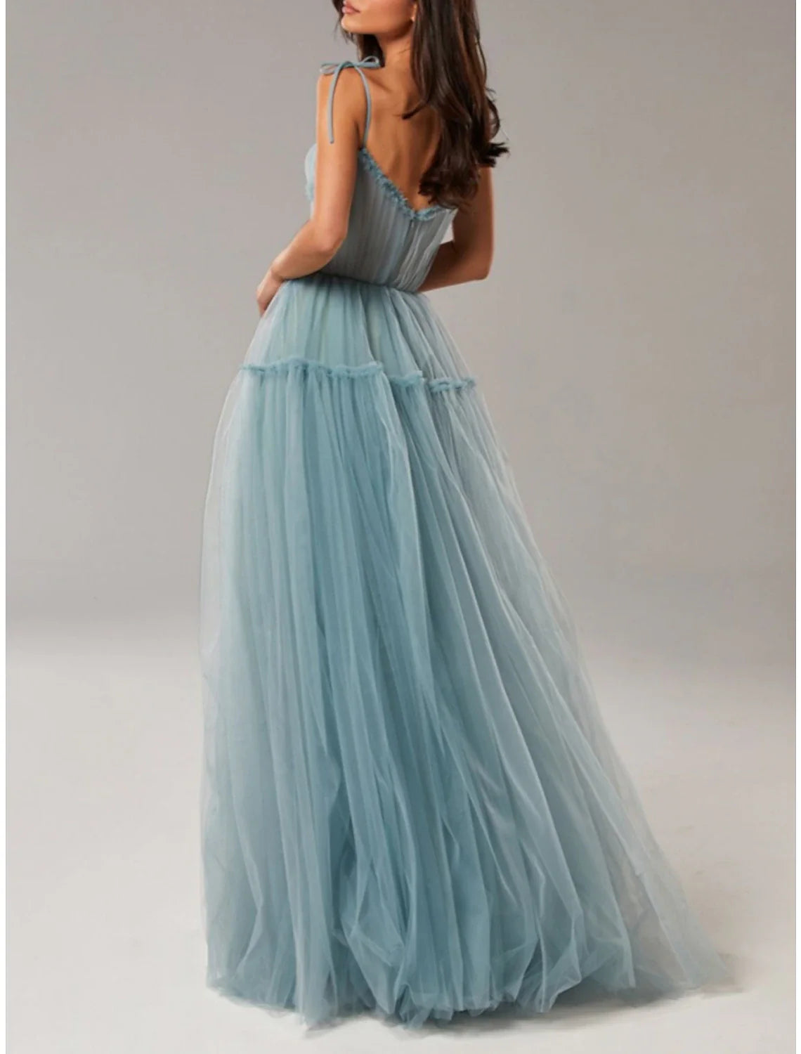 A-Line Evening Gown Elegant Dress Formal Floor Length Sleeveless Spaghetti Strap Tulle with Bow(s) Pleats