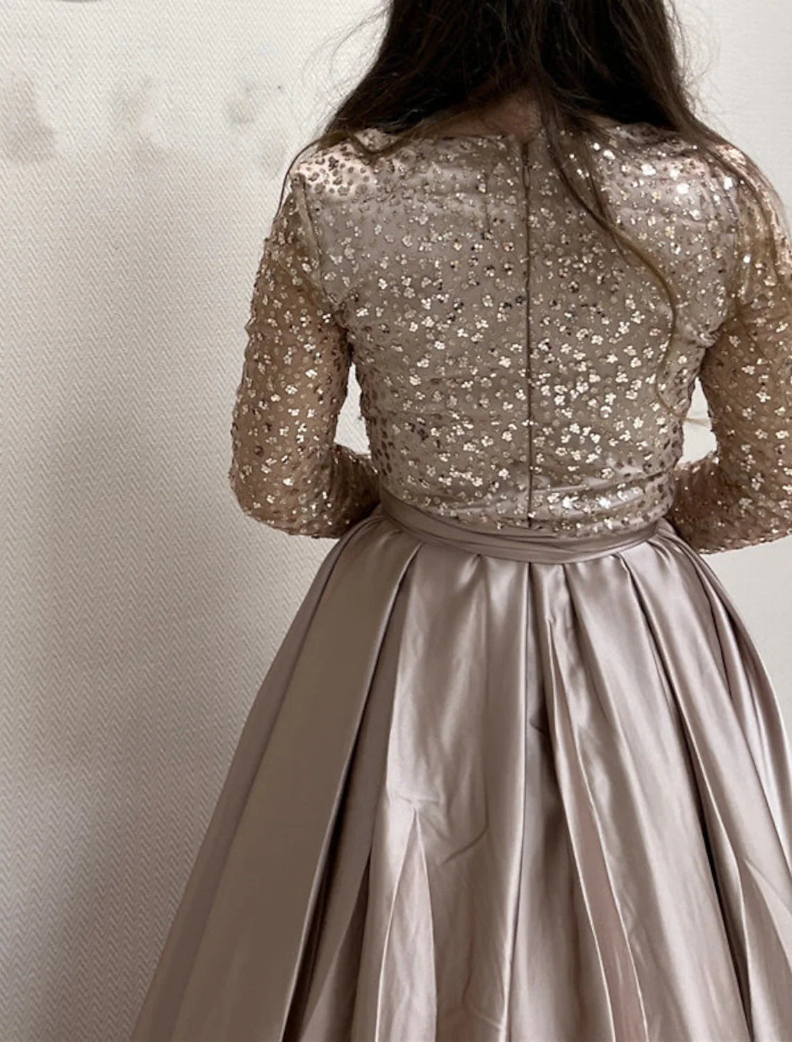 A-Line Evening Gown Elegant Dress Wedding Guest Fall Court Train Long Sleeve V Neck Satin with Pearls Strappy