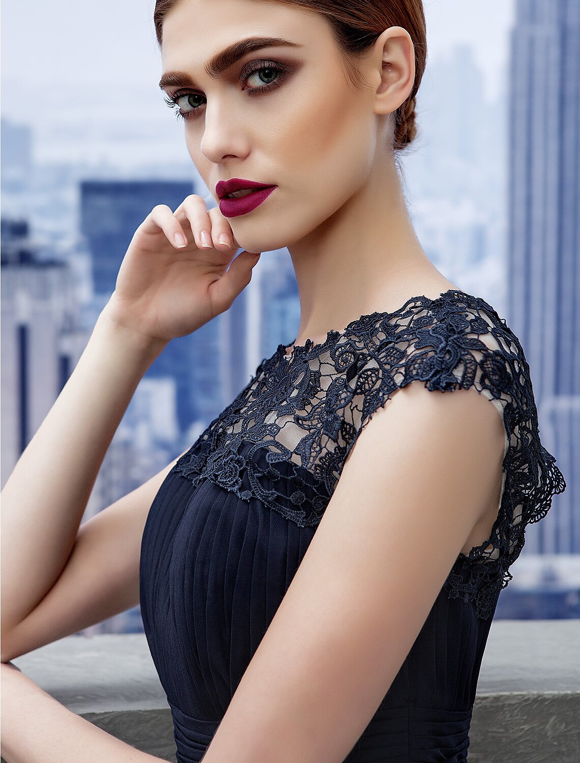 A-Line Evening Gown Empire Dress Wedding Guest Formal Evening Floor Length Short Sleeve Boat Neck Bridesmaid Dress Chiffon with Ruched Lace Insert