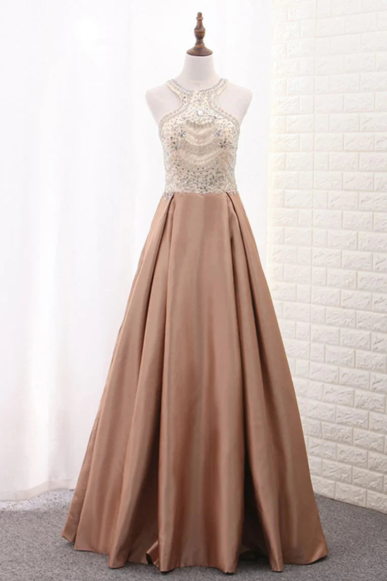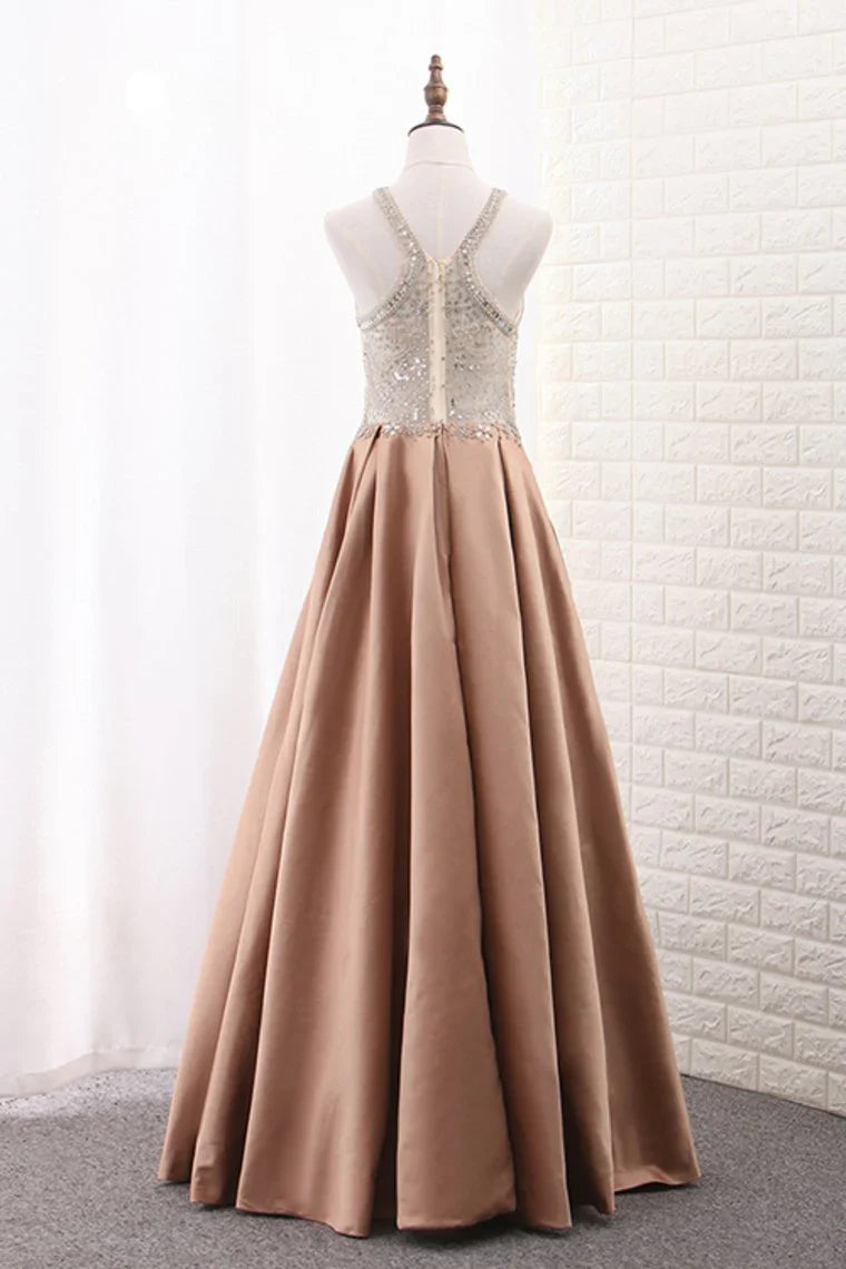 A Line Formal Dresses Scoop Satin With Beads Sweep Train
