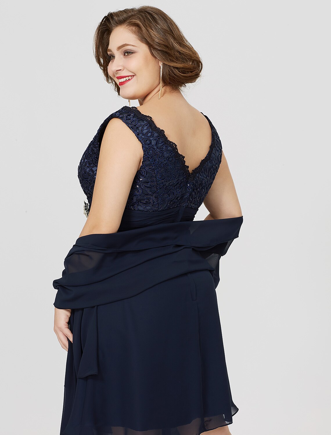 A-Line Mother of the Bride Dress Classic & Timeless Plus Size Wrap Included V Neck Knee Length Chiffon Lace Sleeveless yes with Ruched Crystal Brooch