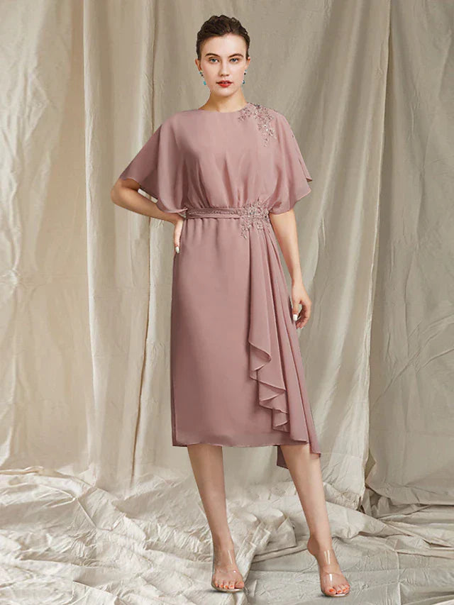 A-Line Mother of the Bride Dress Elegant Jewel Neck Knee Length Chiffon Short Sleeve with Sash / Ribbon Beading Appliques