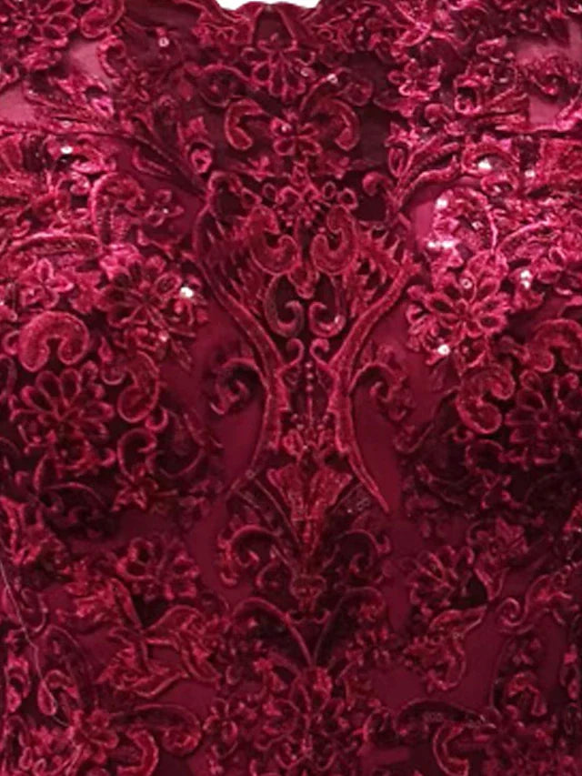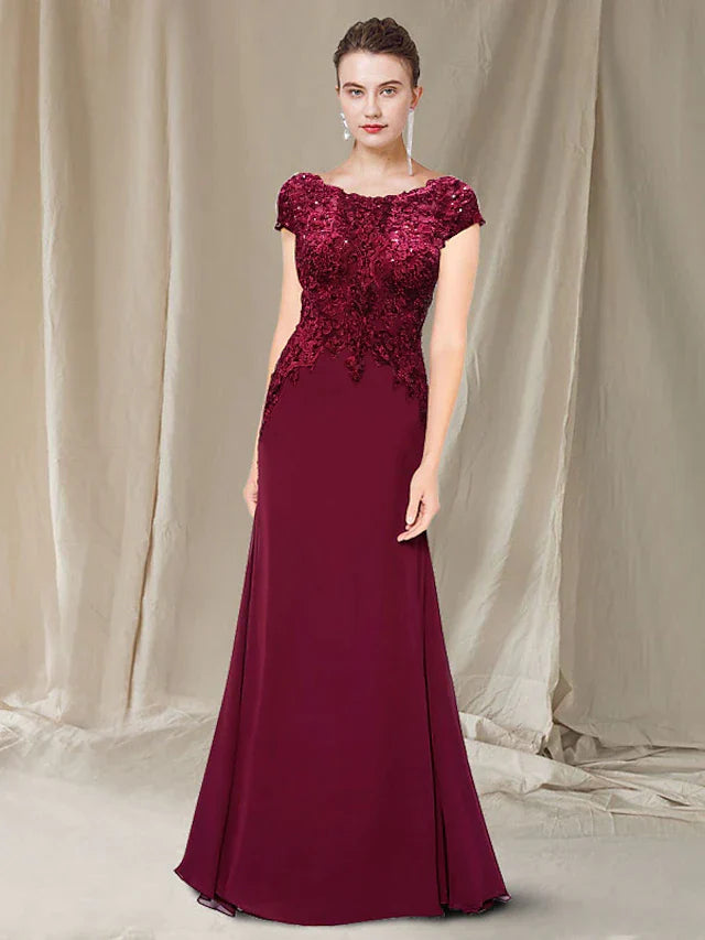 A-Line Mother of the Bride Dress Elegant Jewel Neck Sweep / Brush Train Chiffon Lace Short Sleeve with Appliques