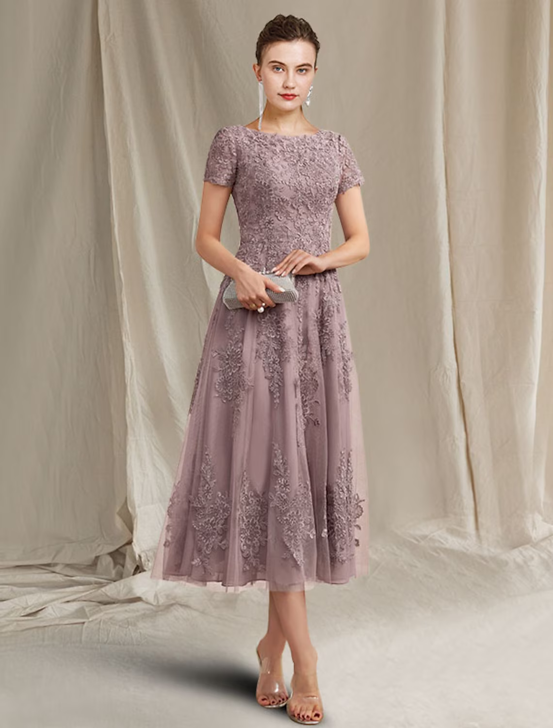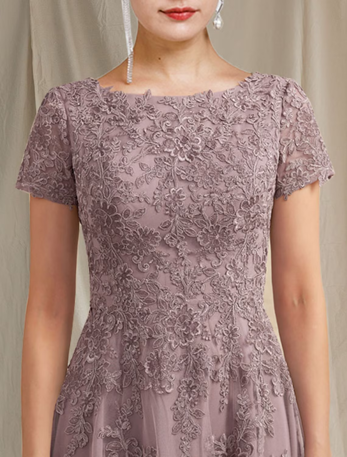 A-Line Mother of the Bride Dress Elegant Lace Tulle Short Sleeve with Appliques