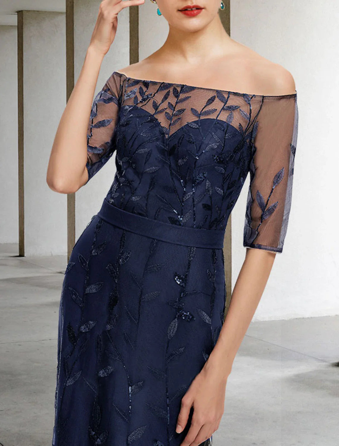 A-Line Mother of the Bride Dress Elegant Sparkle & Shine Off Shoulder Floor Length Lace Tulle Half Sleeve with Sequin Appliques