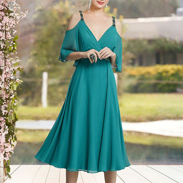 A-Line Mother of the Bride Dress Elegant Sweet V Neck Tea Length Chiffon Sleeveless with Sash / Ribbon Beading