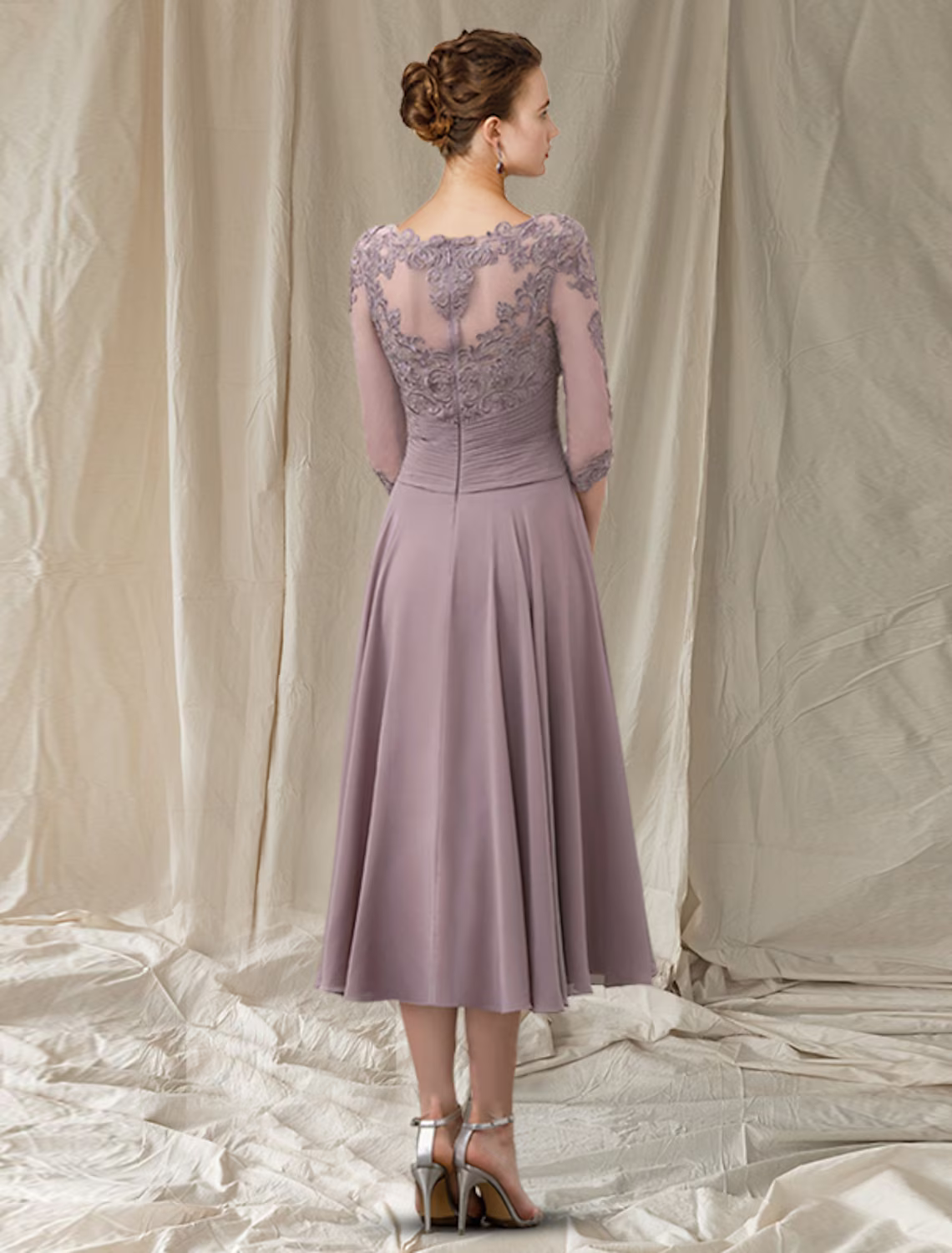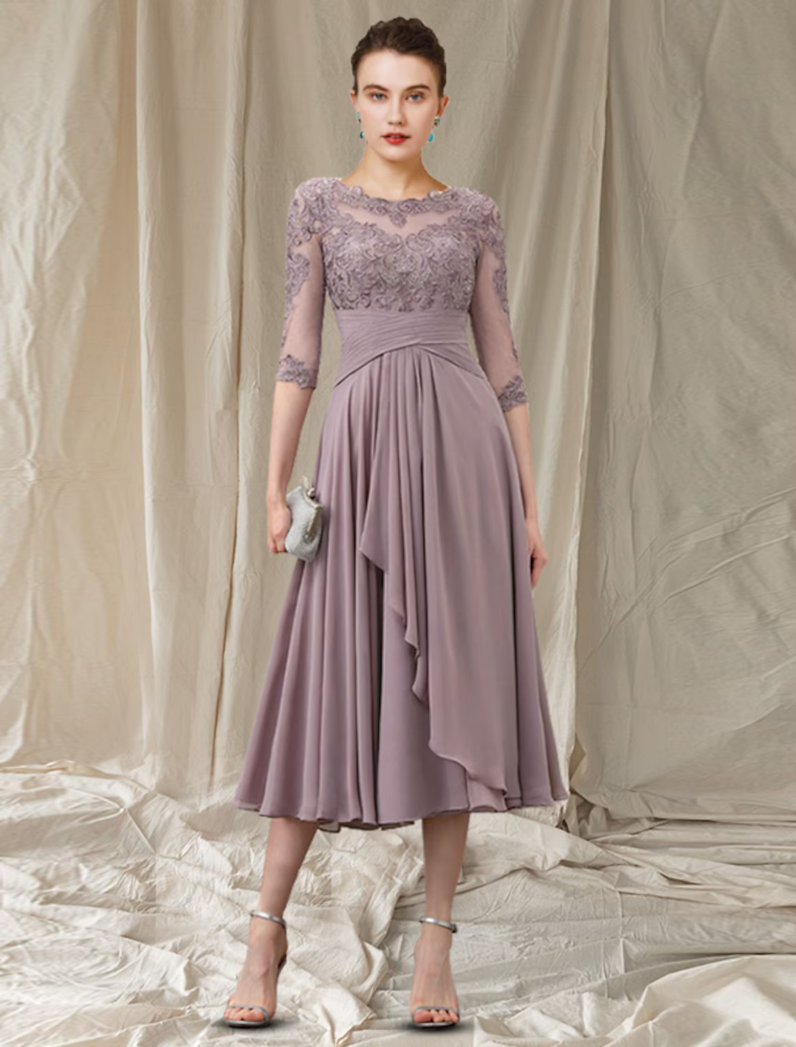 A-Line Mother of the Bride Dress Elegant Tea Length Chiffon Lace Half Sleeve with Pleats Ruched Beading