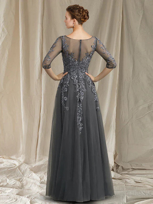 A-Line Mother of the Bride Dress Elegant V Neck Floor Length Chiffon Lace Half Sleeve with Appliques