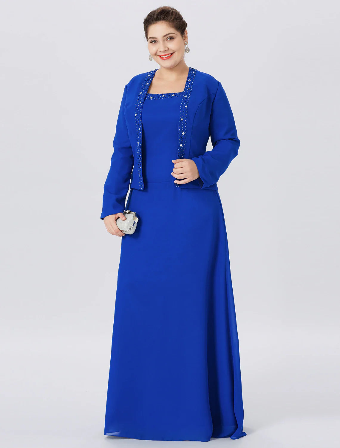 A-Line Mother of the Bride Dress Formal Classic & Timeless Elegant & Luxurious Plus Size Straps Floor Length Chiffon Lace Long Sleeve Wrap Included with Pearls Crystals