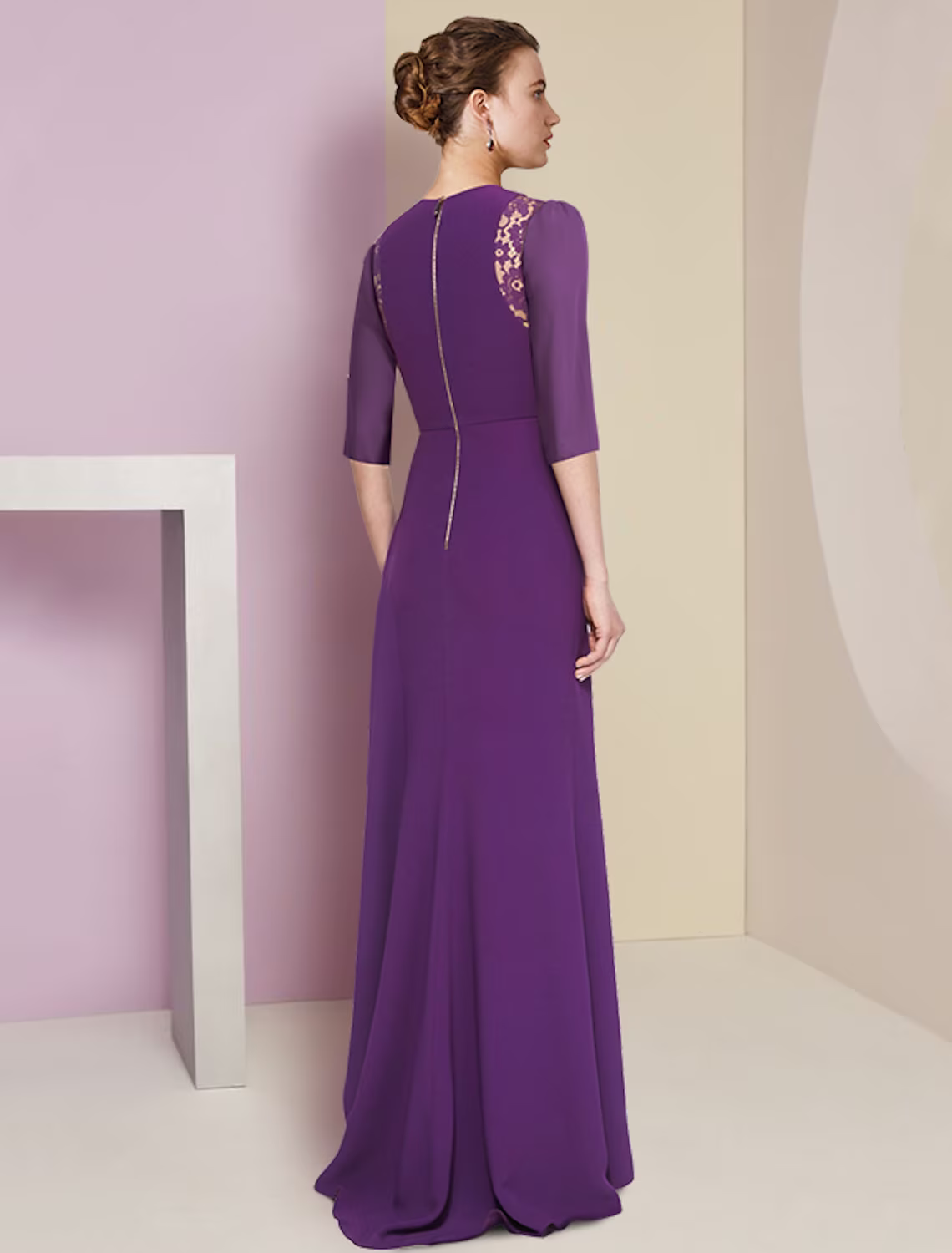 A-Line Mother of the Bride Dress Formal Elegant Scoop Neck Lace Stretch Fabric Half Sleeve with Pleats