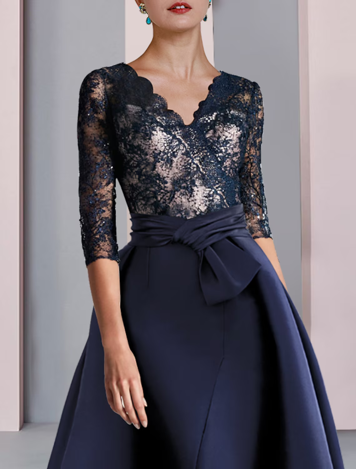 A-Line Mother of the Bride Dress Formal Party Elegant V Neck Floor Length Satin Lace Half Sleeve with Bow(s) Pleats Split Front