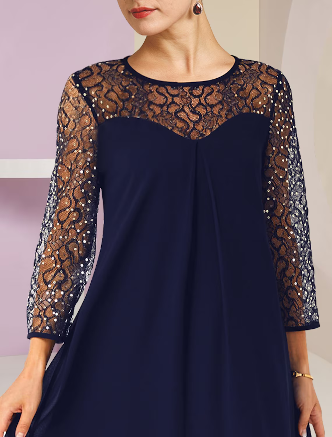 A-Line Mother of the Bride Dress Formal Wedding Guest Elegant Scoop Neck Knee Length Lace Sleeve with Sequin