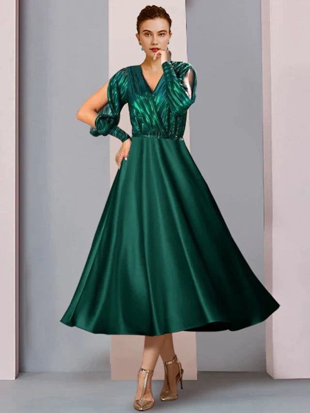 A-Line Mother of the Bride Dress Formal Wedding Guest Party Sparkle & Shine V Neck Tea Length Satin Charmeuse Half Sleeve with Pleats