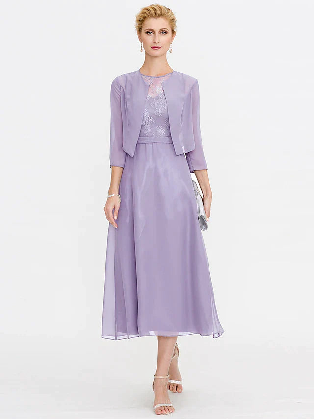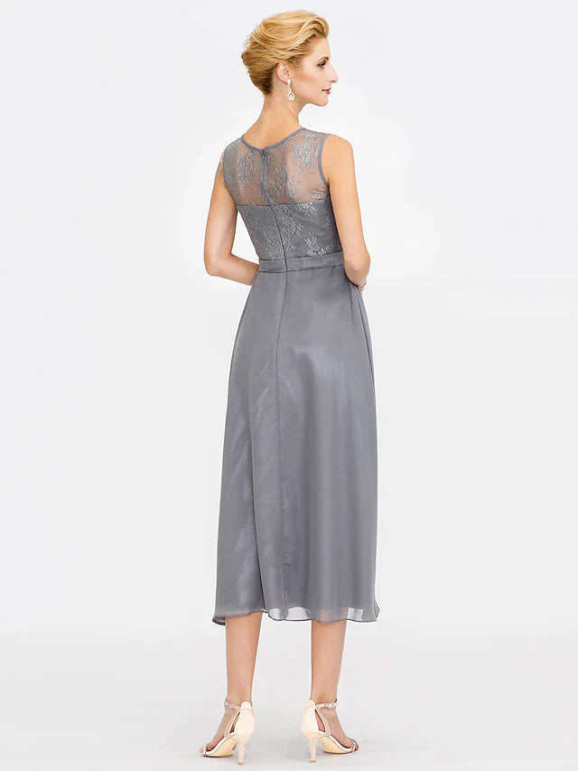A-Line Mother of the Bride Dress Plus Size Elegant Illusion Neck Tea Length Chiffon Corded Lace Sleeveless Wrap Included with Lace Pleats