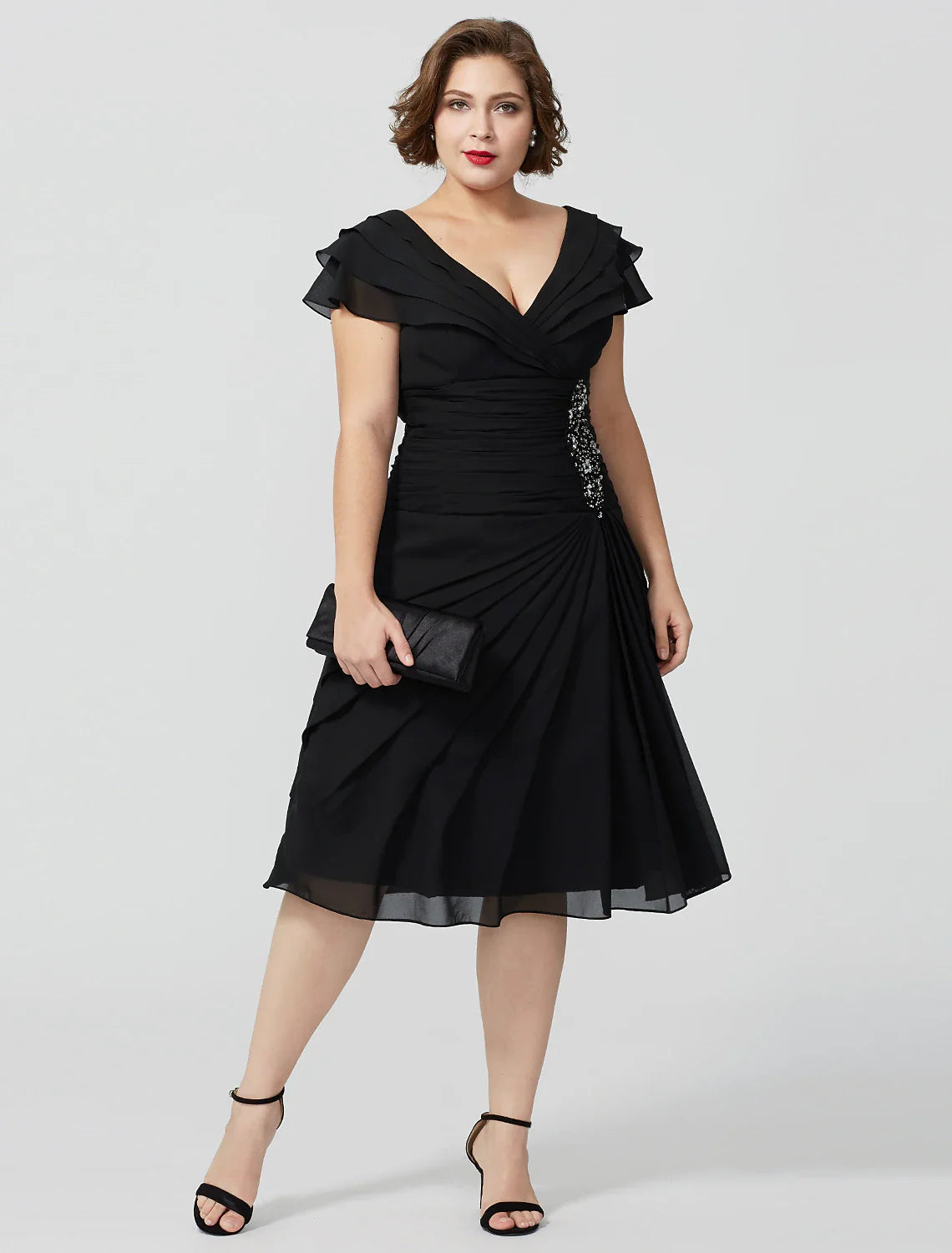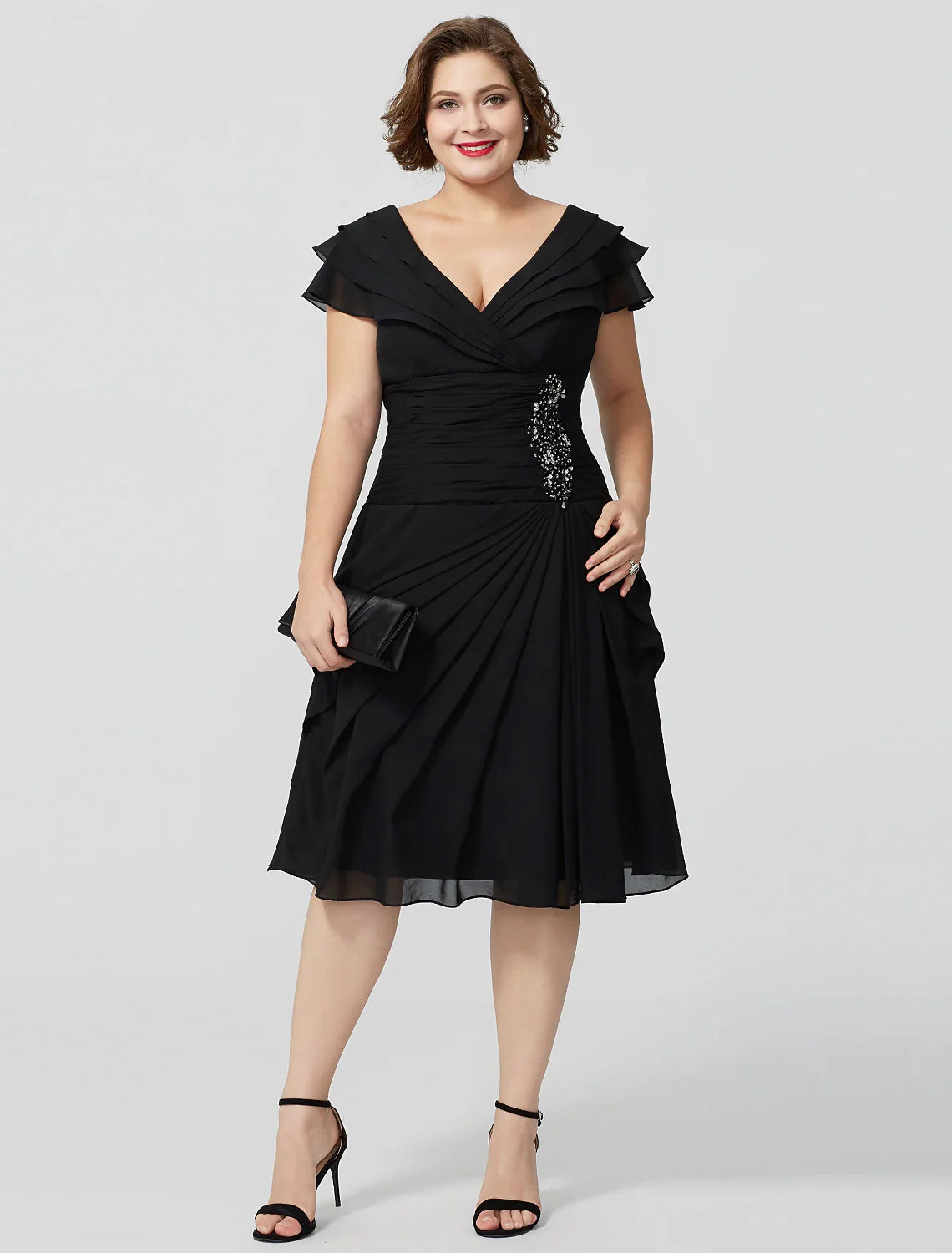 A-Line Mother of the Bride Dress Plus Size Elegant Sexy V Neck Knee Length Chiffon Short Sleeve No with Beading Tiered