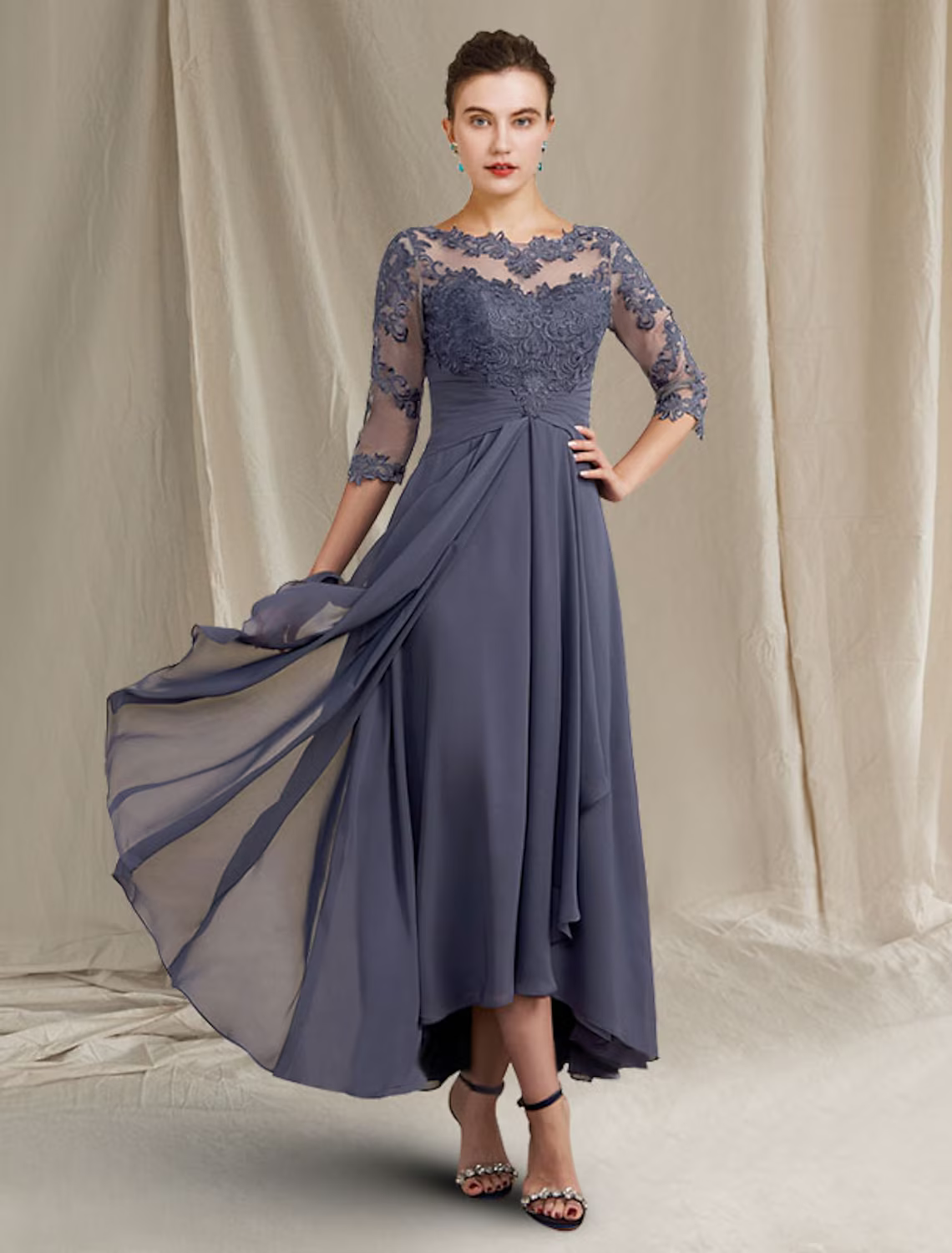 A-Line Mother of the Bride Dress Wedding Guest Elegant High Low Scoop Neck Asymmetrical Satin Lace Short Sleeve with Bow(s) Pleats Appliques