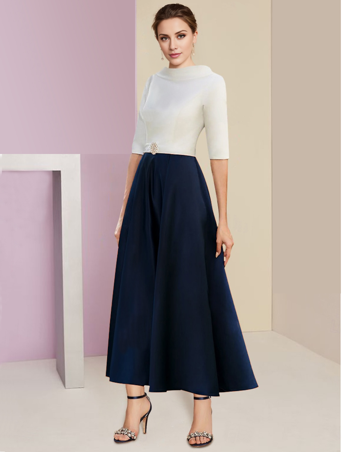 A-Line Mother of the Bride Dress Wedding Guest Elegant Vintage Jewelry Collar Tea Length Charmeuse Satin Half Sleeves with Ruffles Crystals