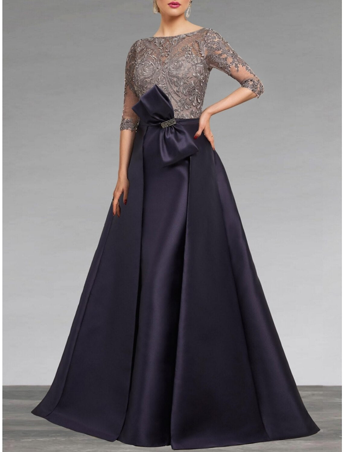 A-Line Mother of the Bride Dress Wedding Guest Party Elegant Scoop Neck Sweep / Brush Train Satin Lace Half Sleeve with Bow(s) Ruching