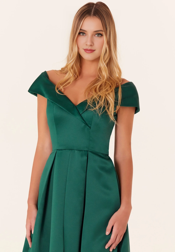A-line off shoulder collar short sleeved satin front skirt with slit bridesmaid dress