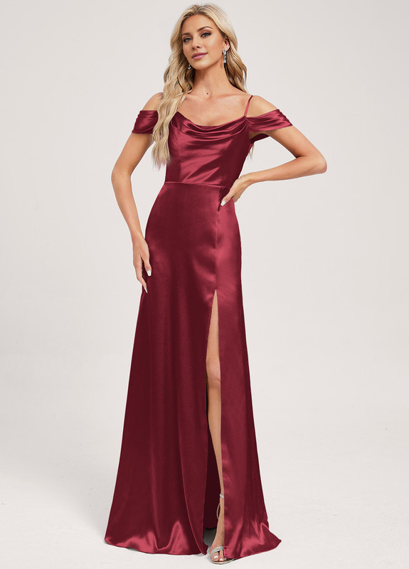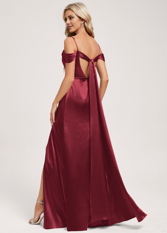 A-line off-the-shoulder floor-length satin bow ruffled bridesmaid dress