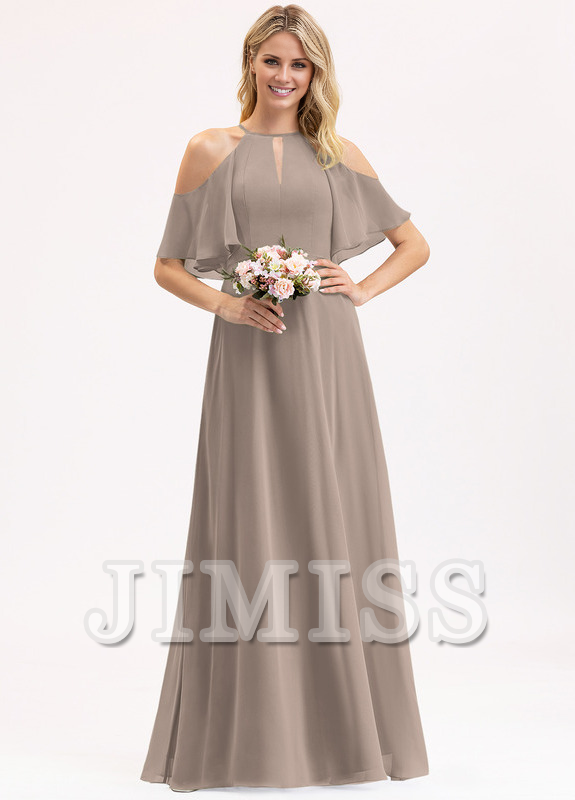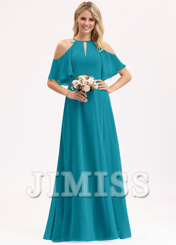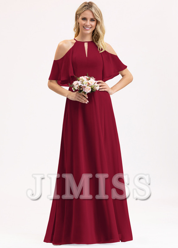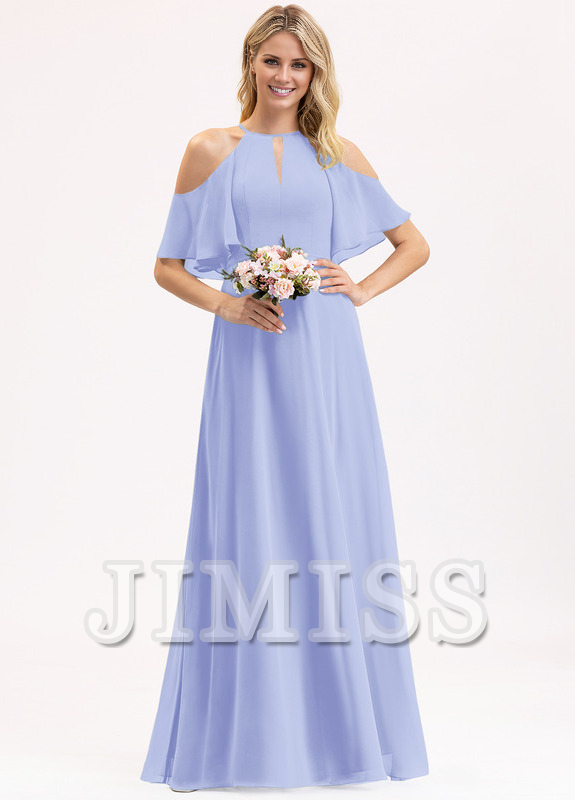 A-line off-the-shoulder scoop neck floor-length chiffon bridesmaid dress