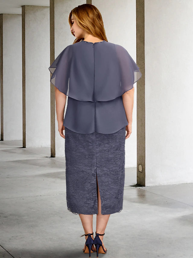 A-Line Plus Size Curve Mother of the Bride Dresses Elegant Dress Formal Tea Length Short Sleeve Jewel Neck Chiffon with Beading Ruffles Slit