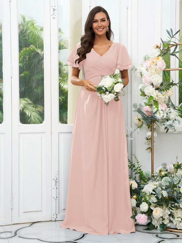 A-Line/Princess Chiffon Ruffles V-neck Short Sleeves Floor-Length Bridesmaid Dresses
