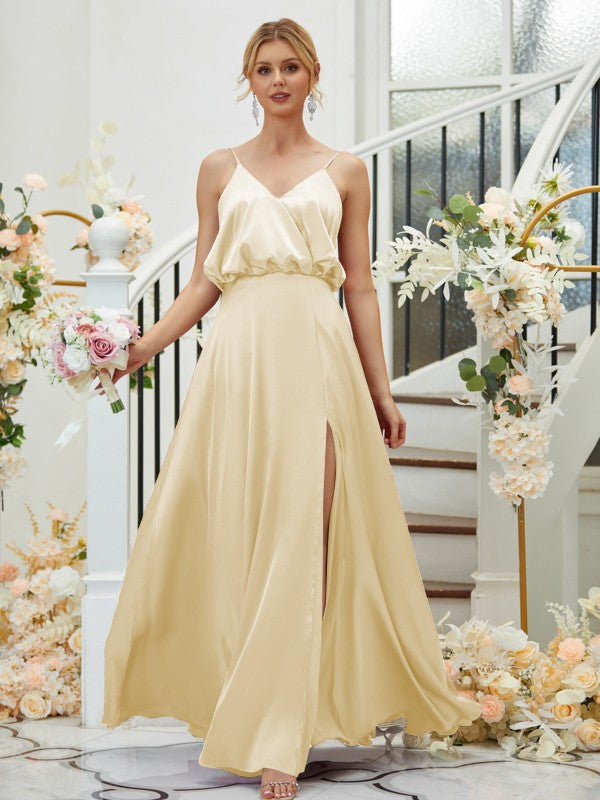 A-Line/Princess Silk like Satin Ruched V-neck Sleeveless Floor-Length Bridesmaid Dresses