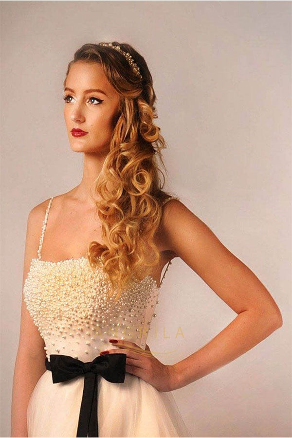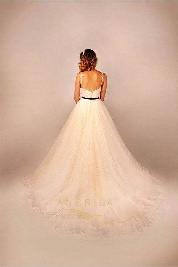 A-line/Princess Spaghetti Straps Beaded Bodice Tulle Vintage Wedding Dresses