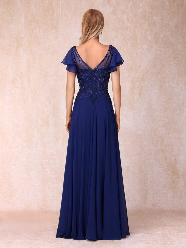 A-line/Princess V-neck short sleeved long formal mother of the bride dress