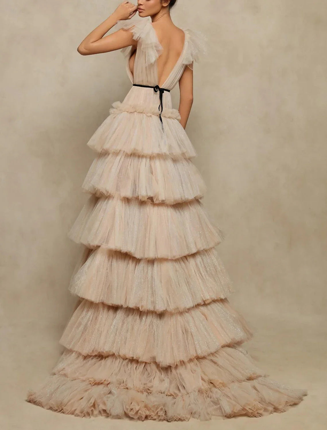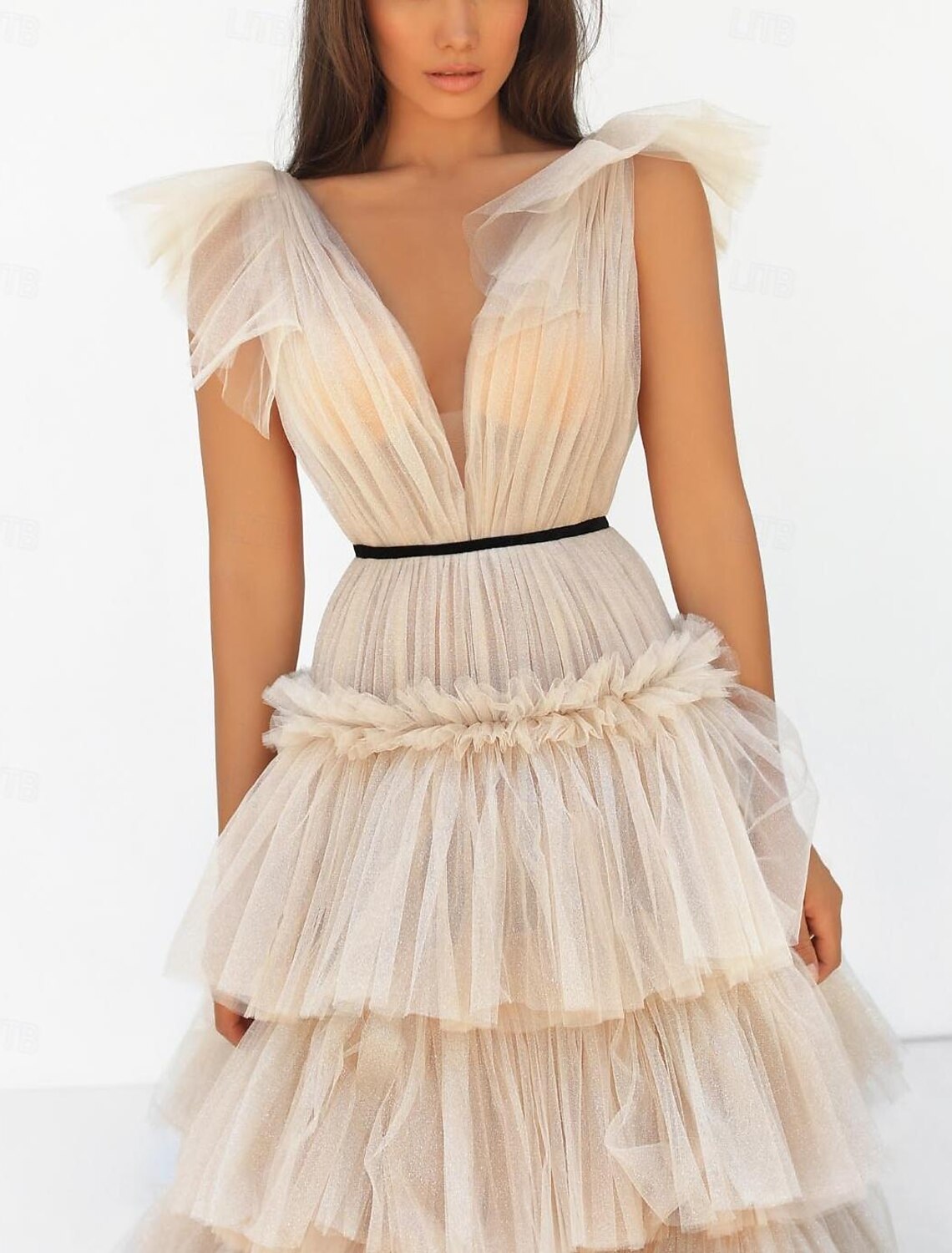 A-Line Prom Dresses Elegant Dress Prom Sweep / Brush Train Sleeveless V Neck Tulle V Back with Ruffles