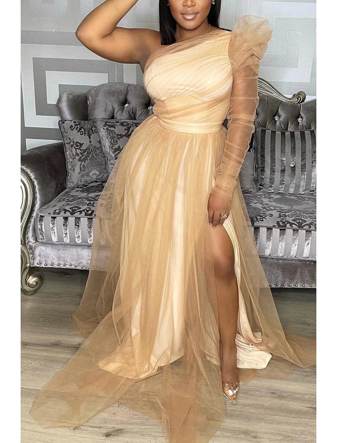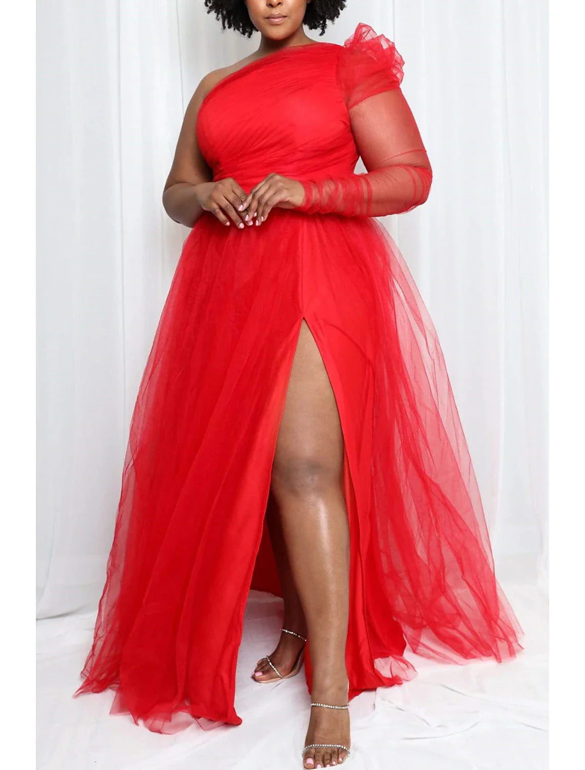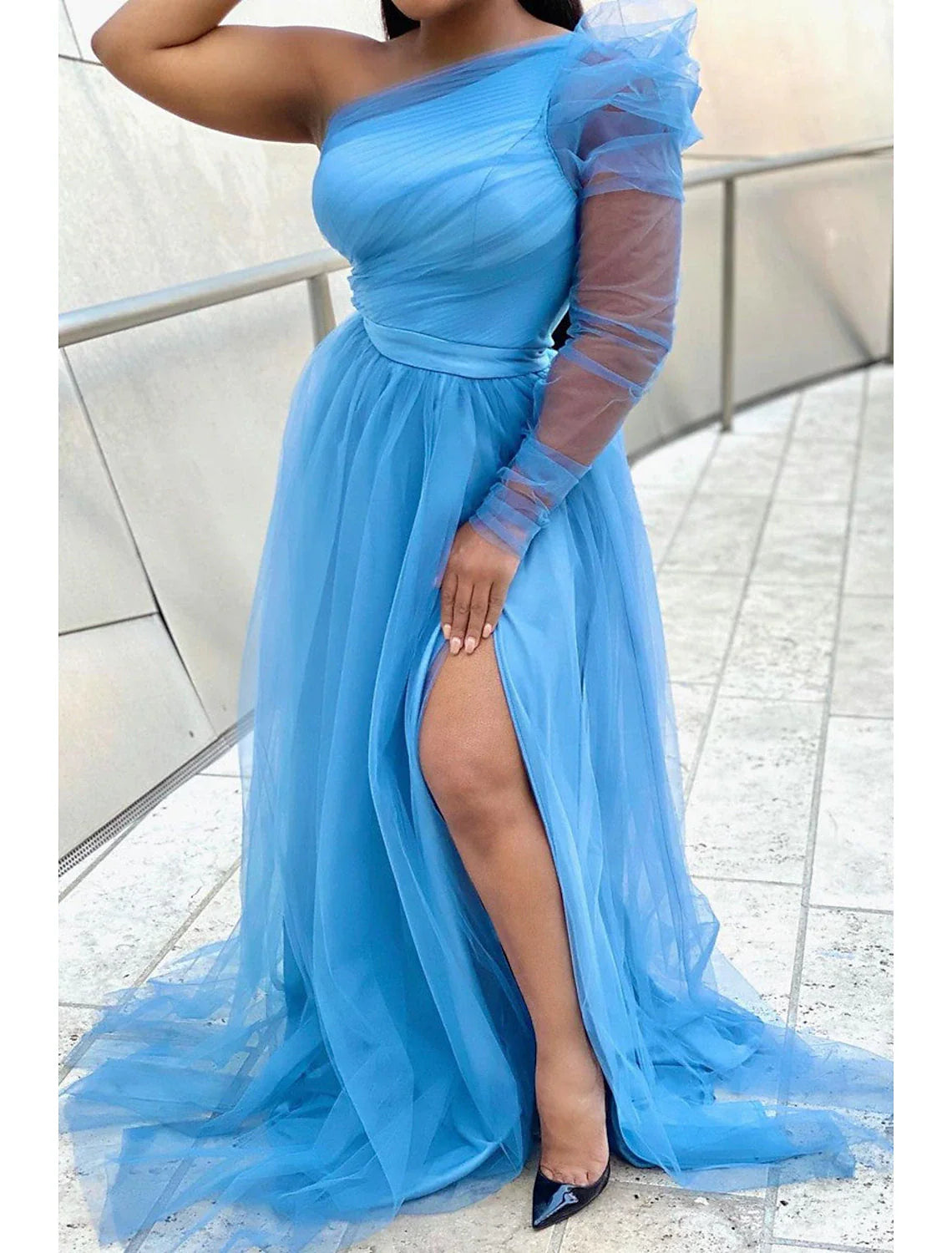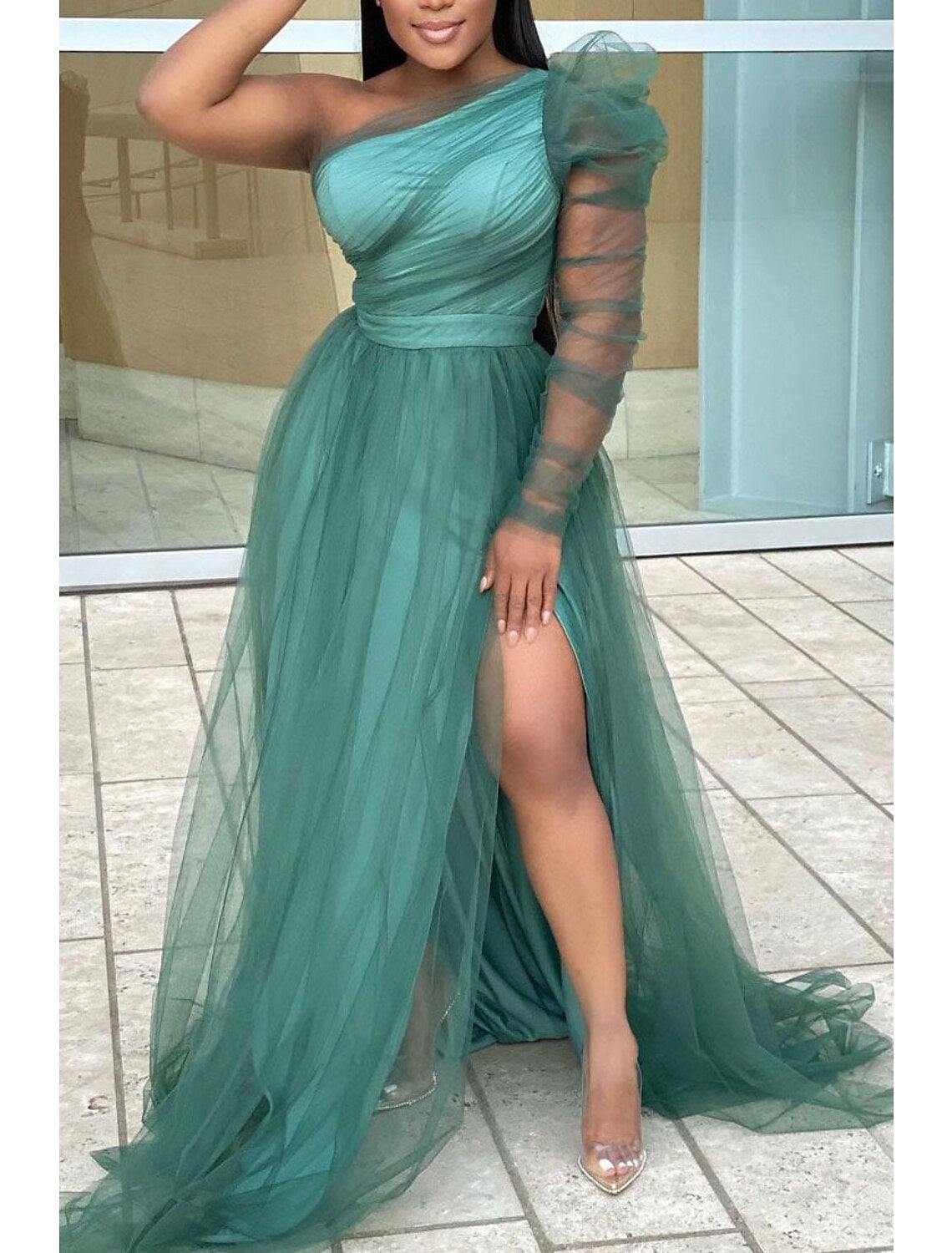 A-Line Prom Dresses Plus Size Dress Wedding Guest Formal Evening Sweep / Brush Train Long Sleeve One Shoulder Wednesday Addams Family Tulle with Slit Pure Color