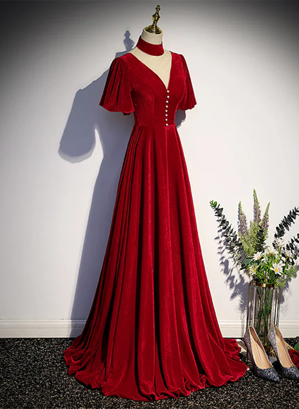 A-Line Red High Neckline Velvet Long Party Dress Short Sleeves Velvet Prom Dress