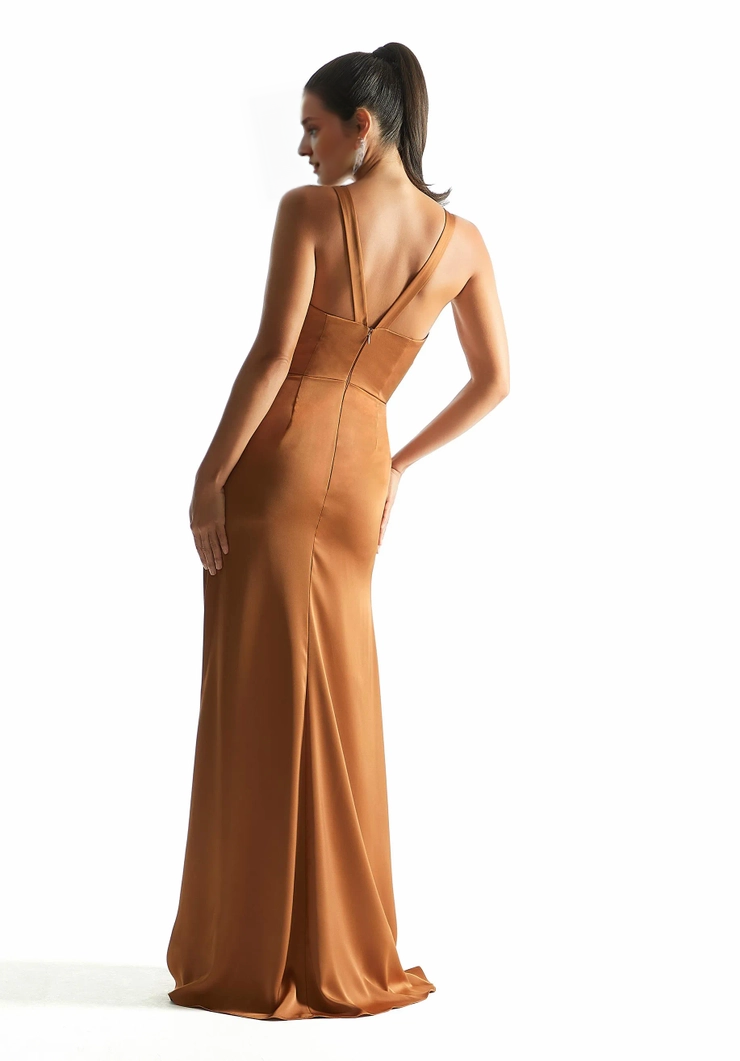 A-line satin V-neck slim fit V-back bridesmaid dress