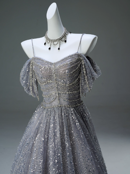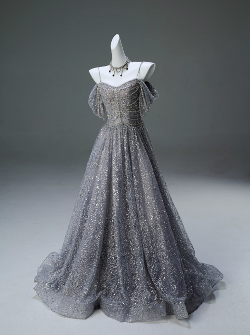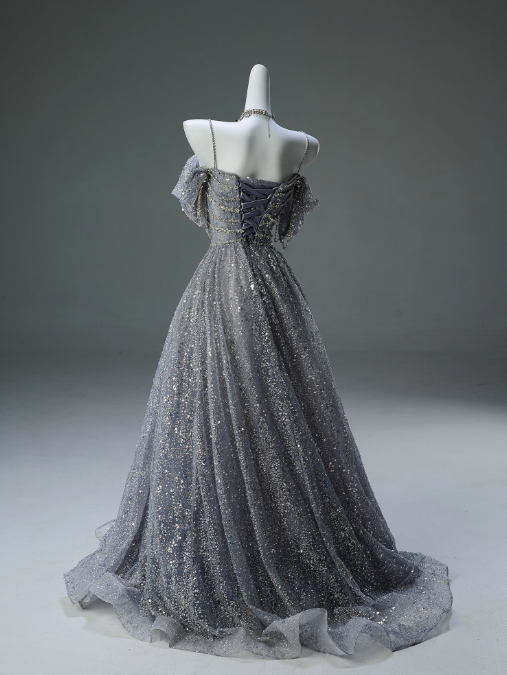 A-Line Spaghetti Strap Mesh Sequin Long Prom Dress Graduation Prom Adult Ceremony Dress ED01626