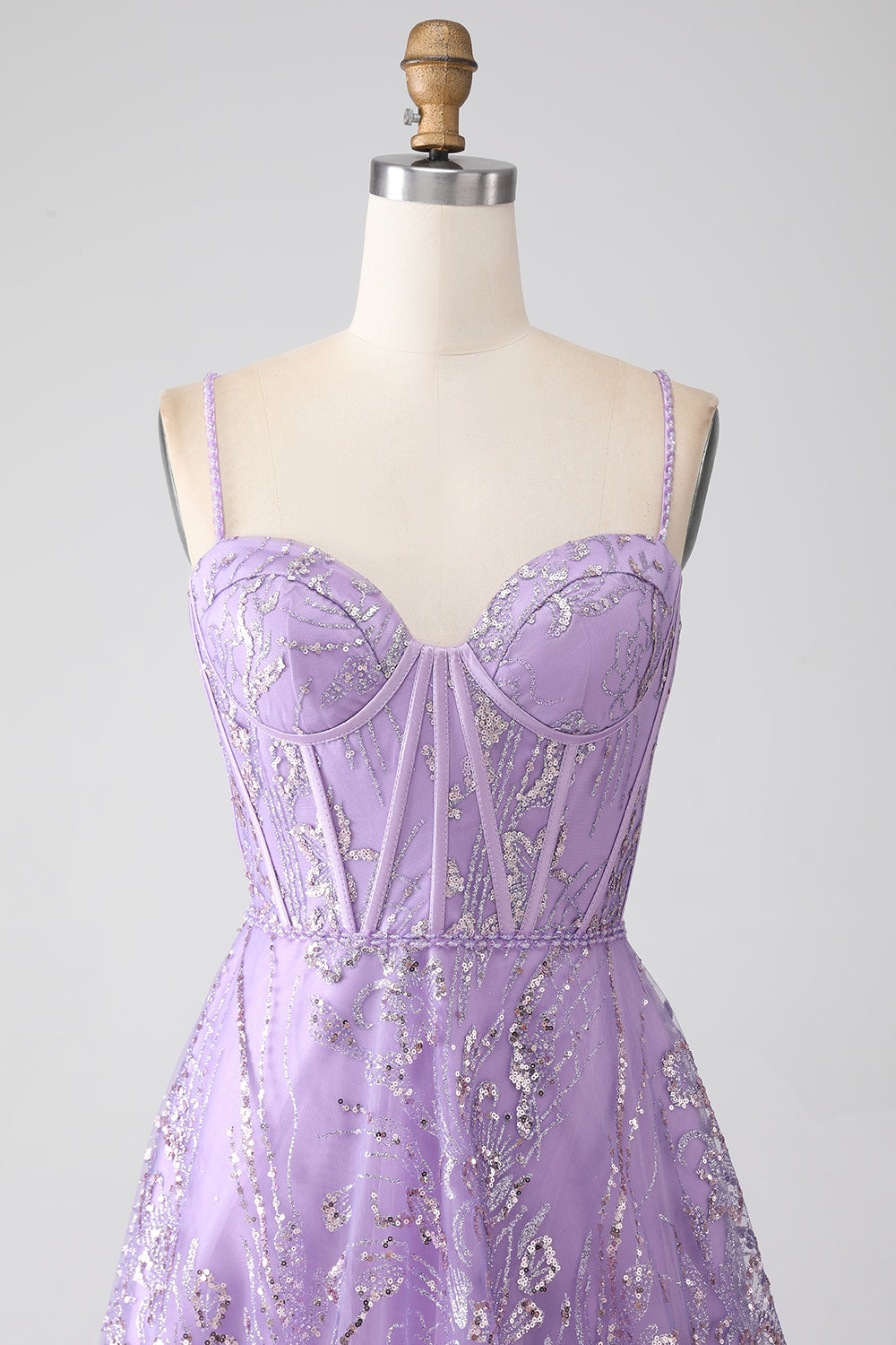 A-Line Spaghetti Straps Lilac Corset Prom Dress with Sequins