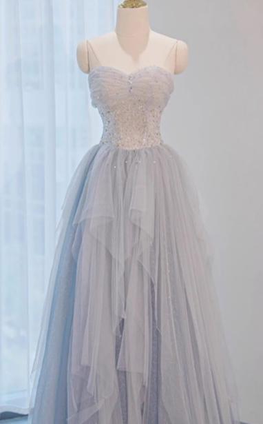 Blue A line tulle sequin long prom dress, blue tulle evening dress - picture color