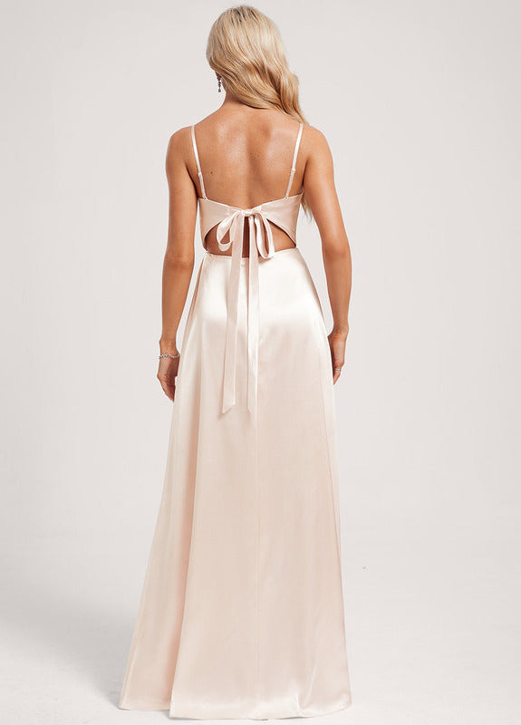 A-line V-neck floor-length satin bow bridesmaid dress