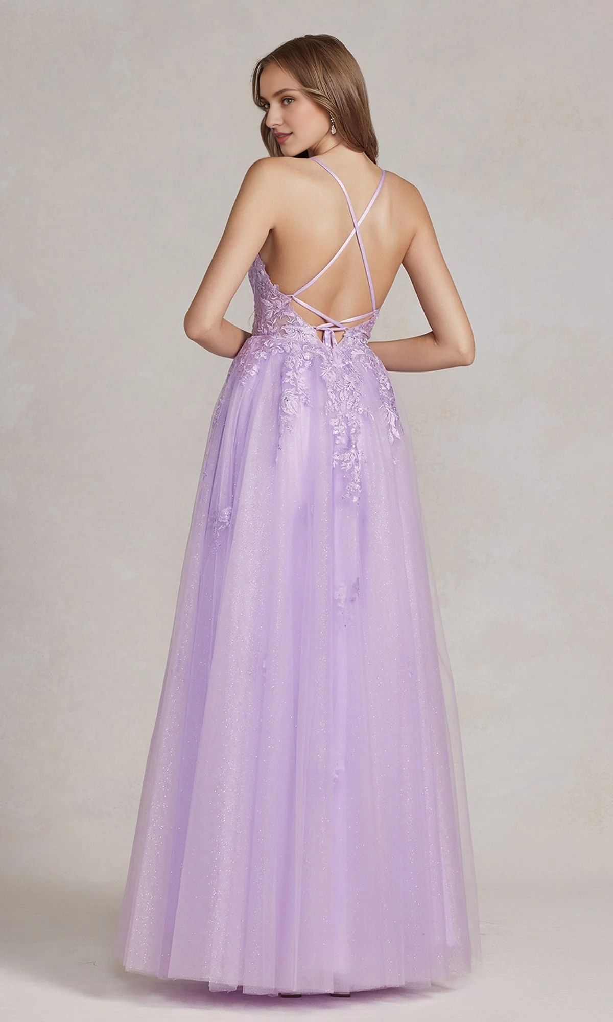 A-line V-neck tight corset embroidered with floral side slits and floor length Prom dress