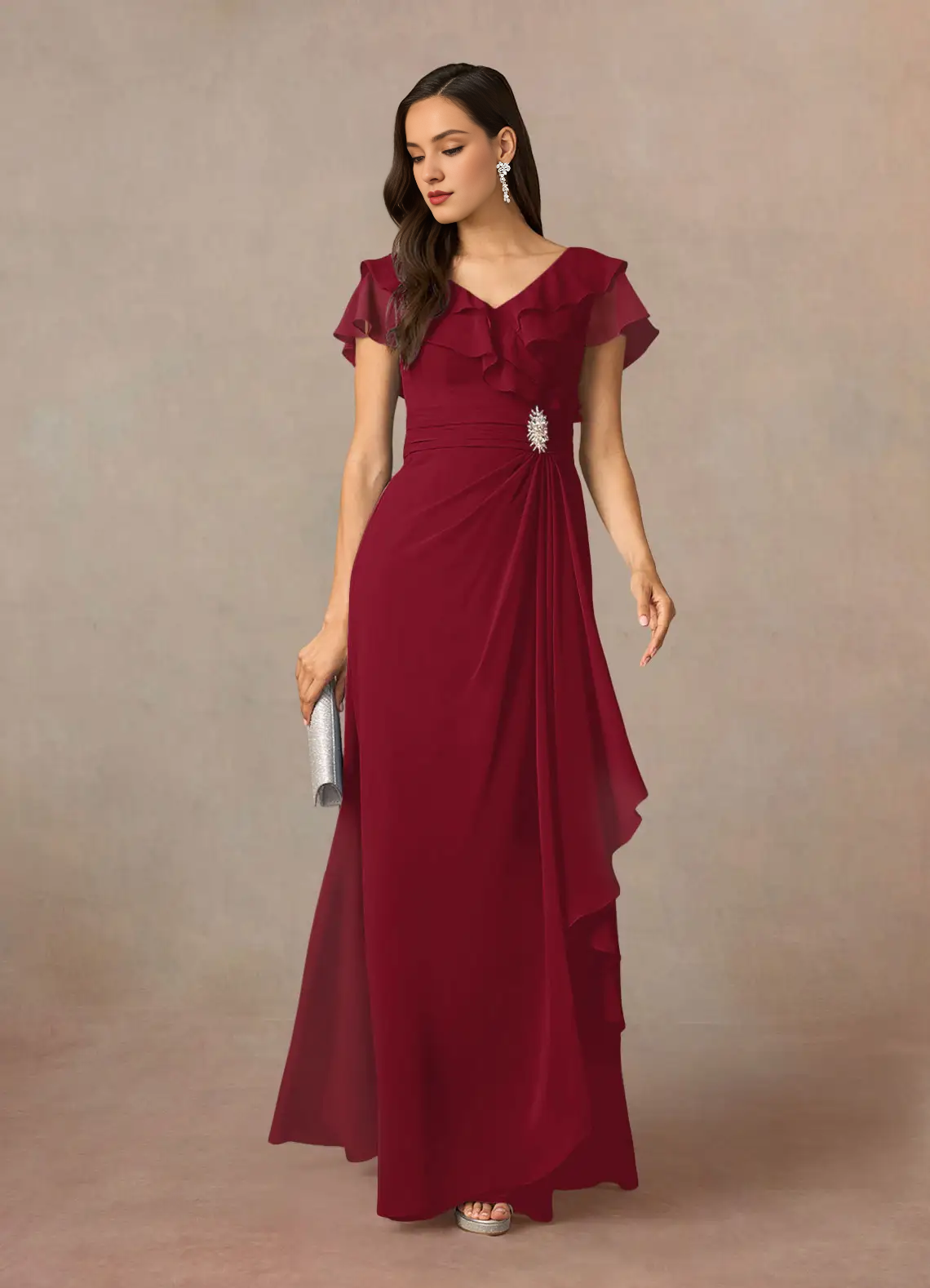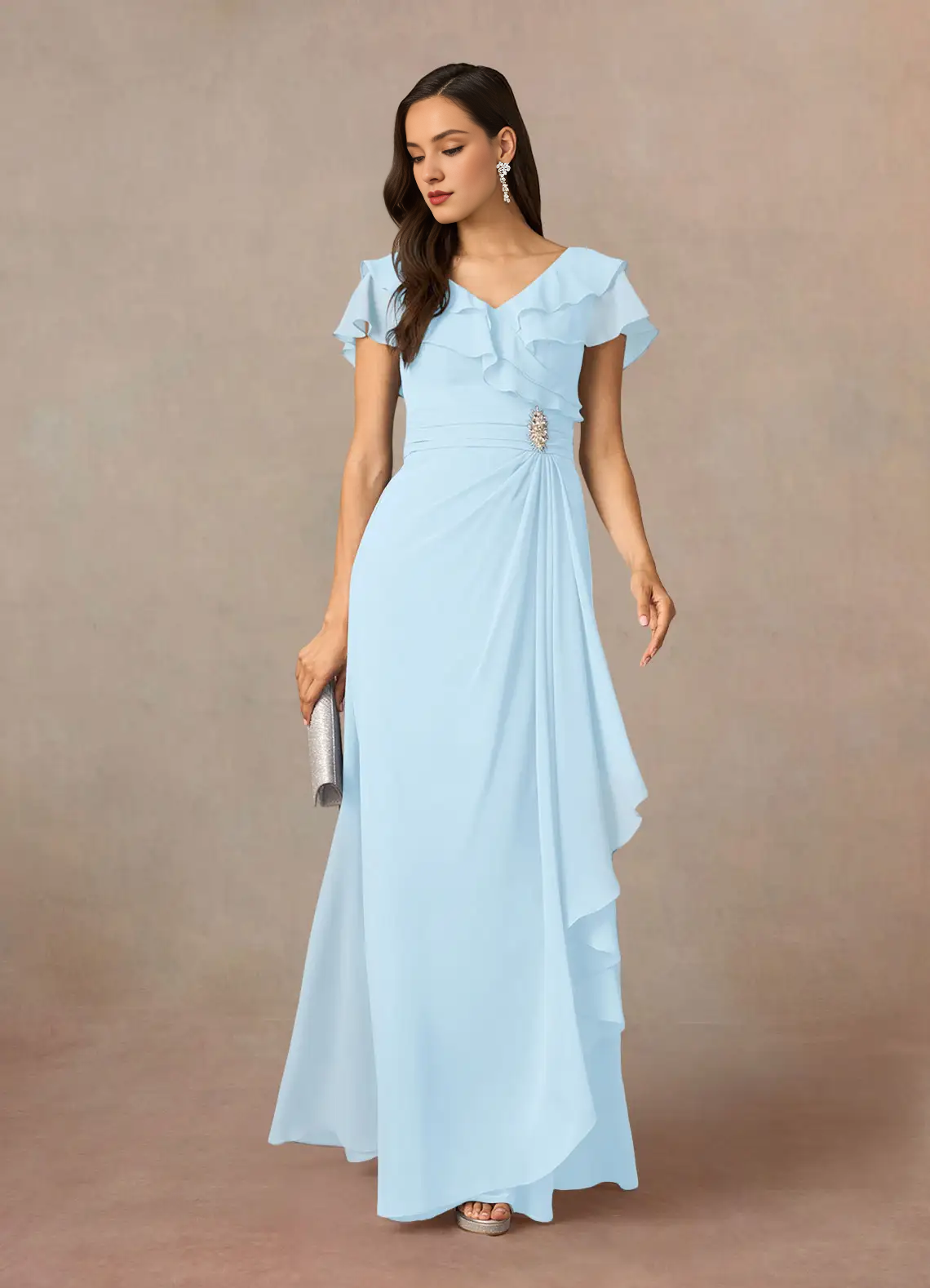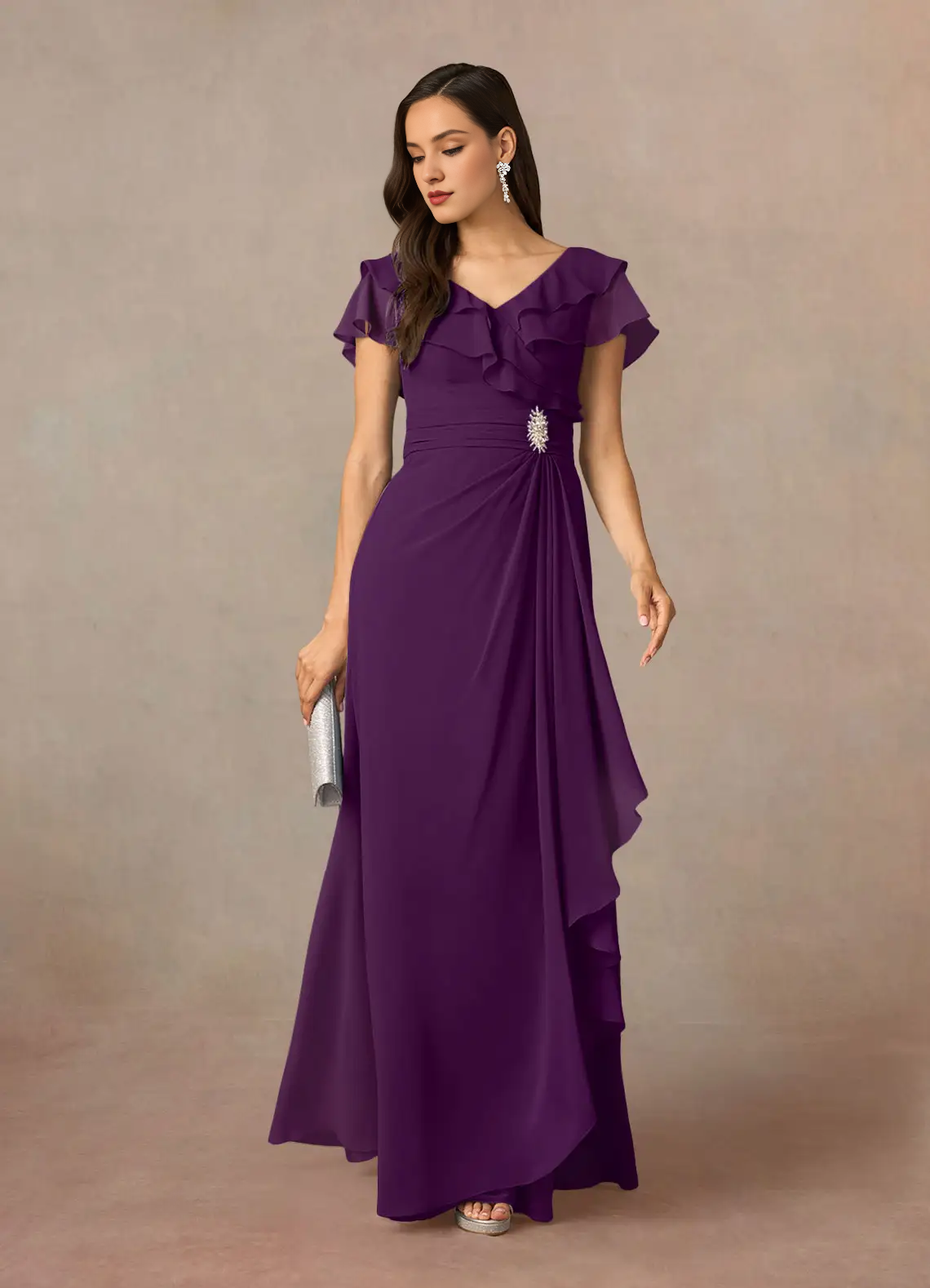 A-link V-neck pleated chiffon and floor length mother of bride dress