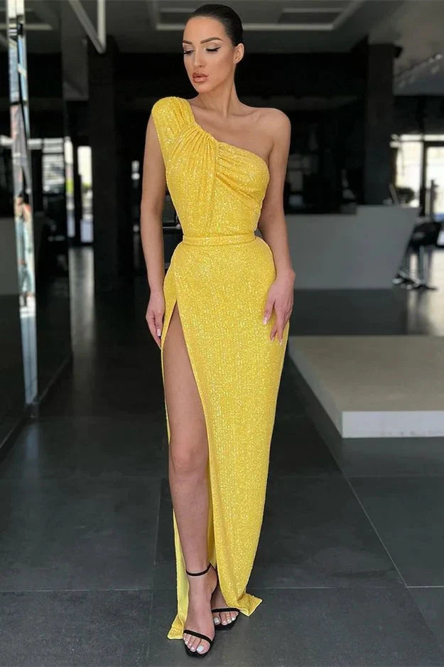 Amazing Yellow One Shoulder Sequins evening Dress Mermaid With Slit