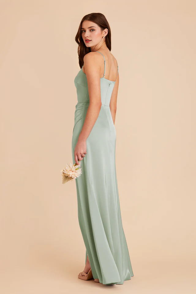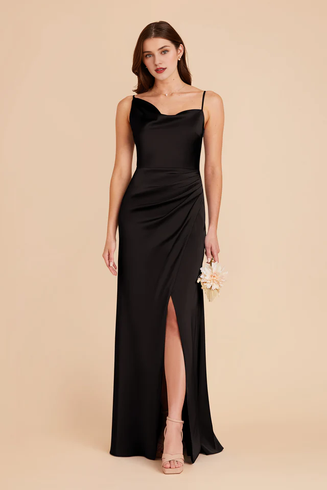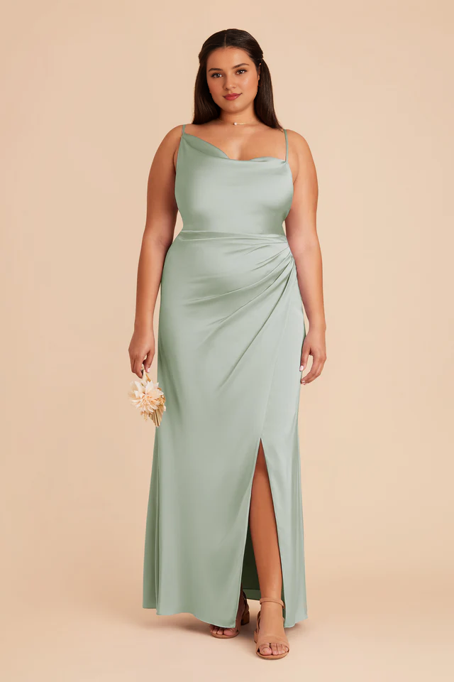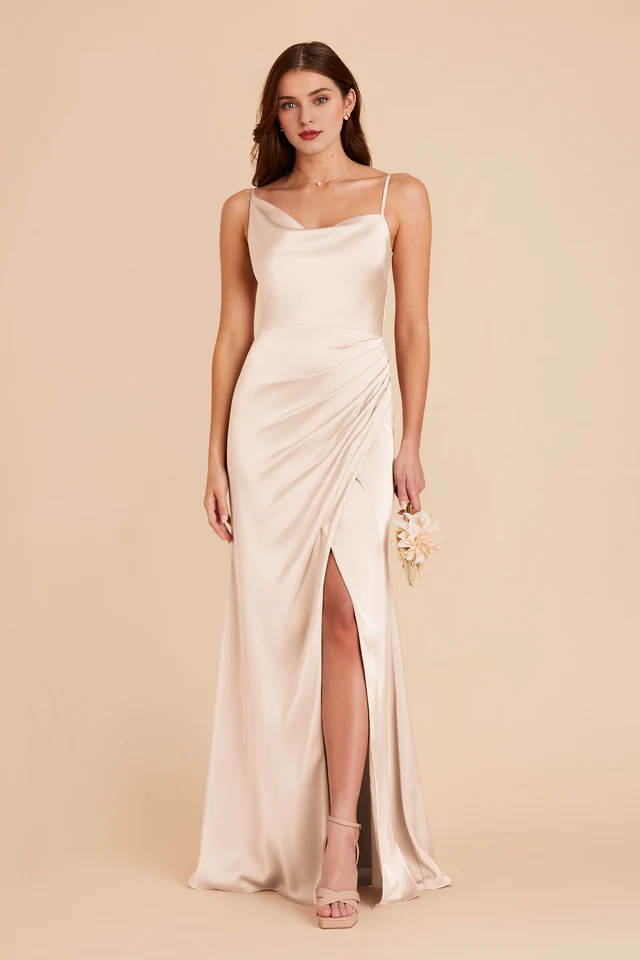 Asymmetric collar satin pillar wrapped slit bridesmaid dress