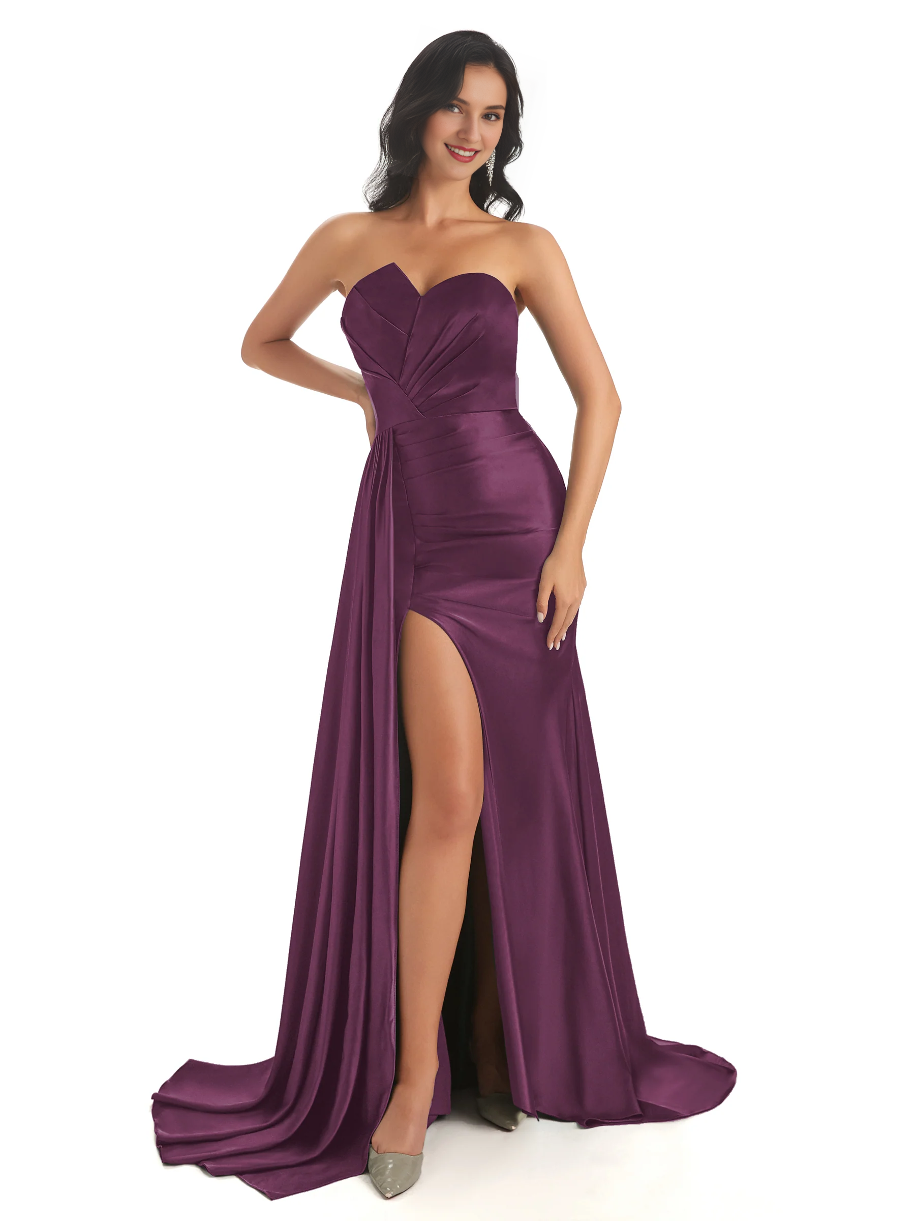 Asymmetric neckline fishtail satin side slit and floor length fishtail bridesmaid dress