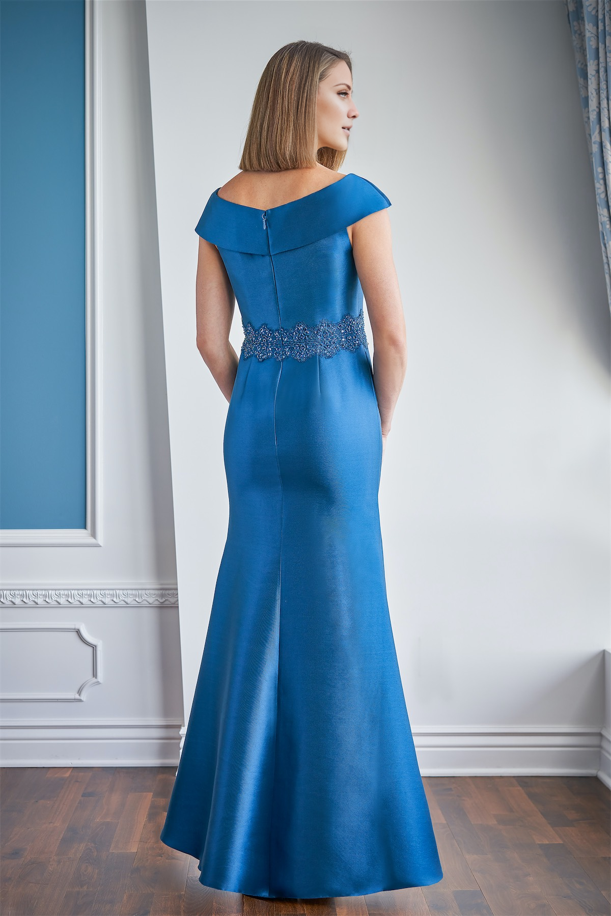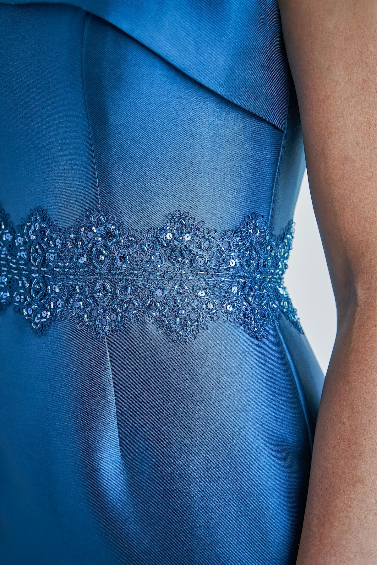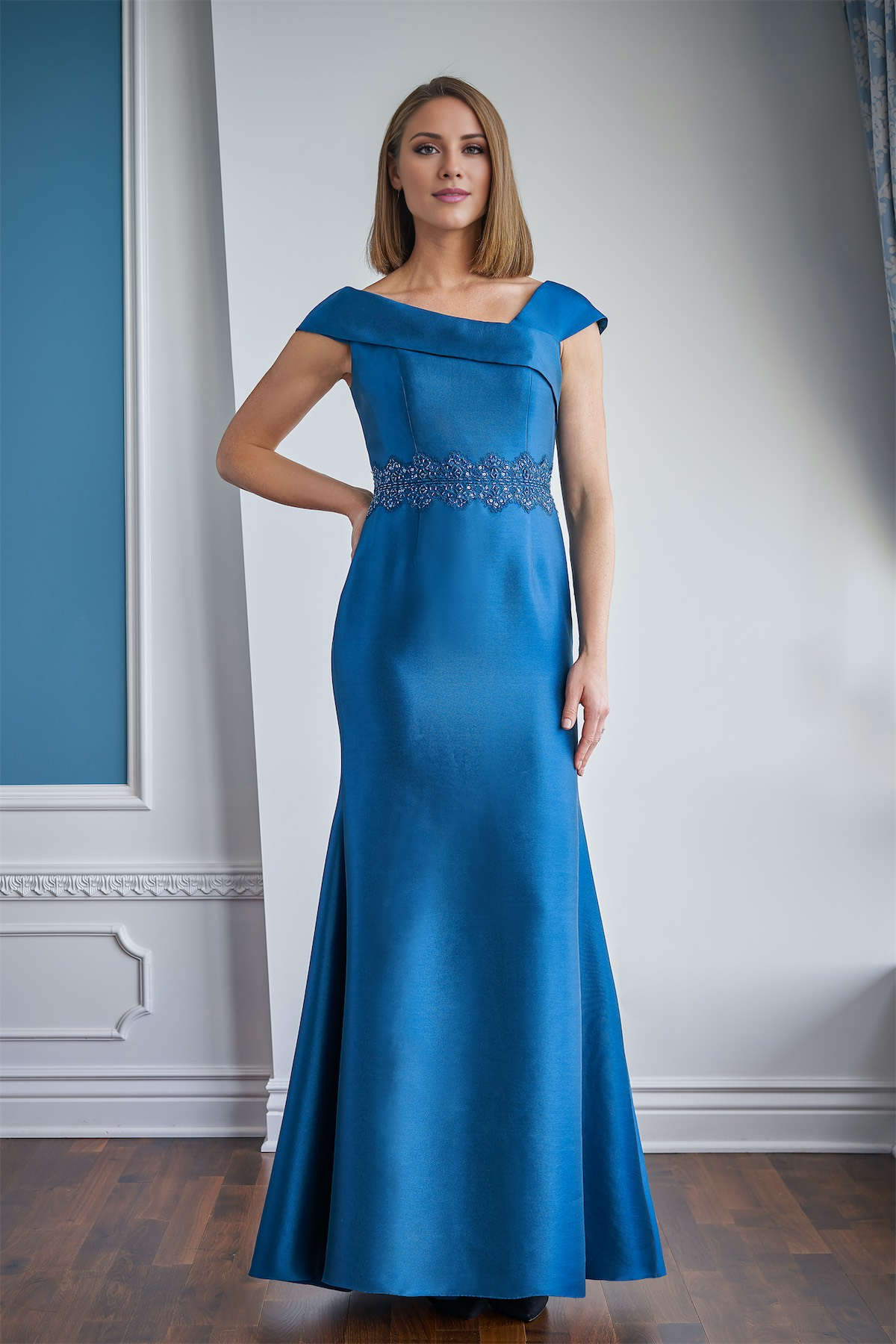 Asymmetric sleeve collar with lace bead waist belt fits mother of bride dresses