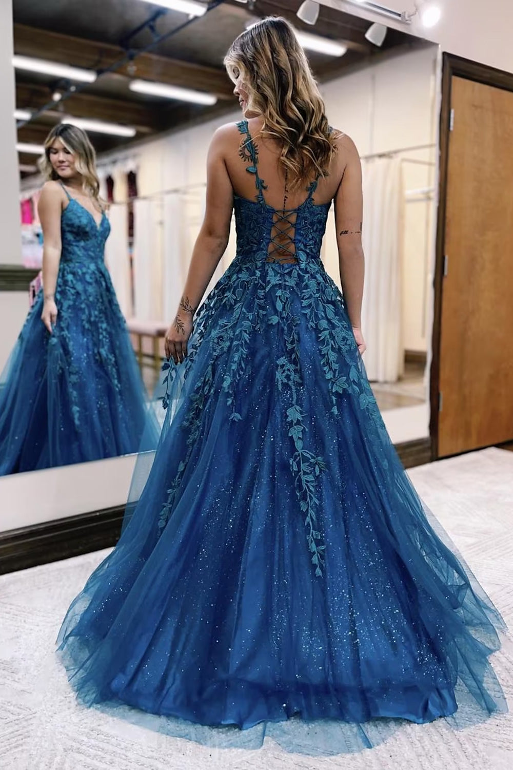 Ball Gown A-Line Prom Dresses Sparkle Shine Dress Formal Floor Length Sleeveless V Neck TulleBackless with Glitter Appliques